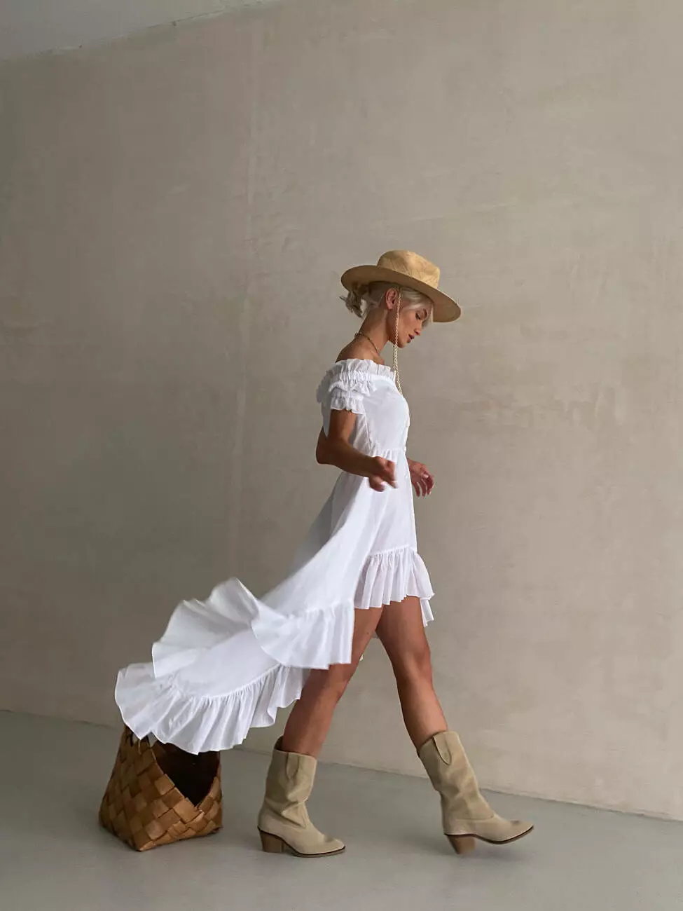 Ніжна сукня MIRANDA в романтичному стилі з відкритими плечима з легкої бавовни, що робить акцент на ніжках, максимально підкреслюючи жіночність.