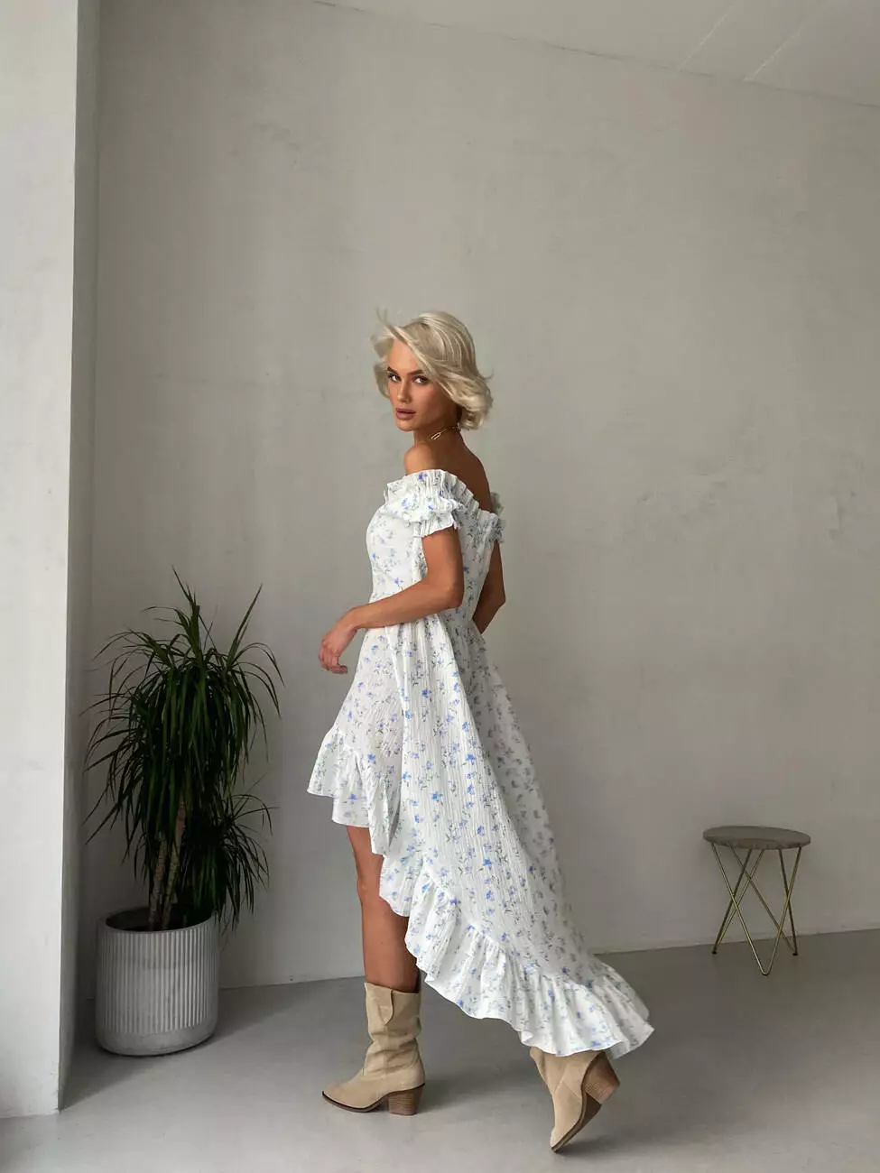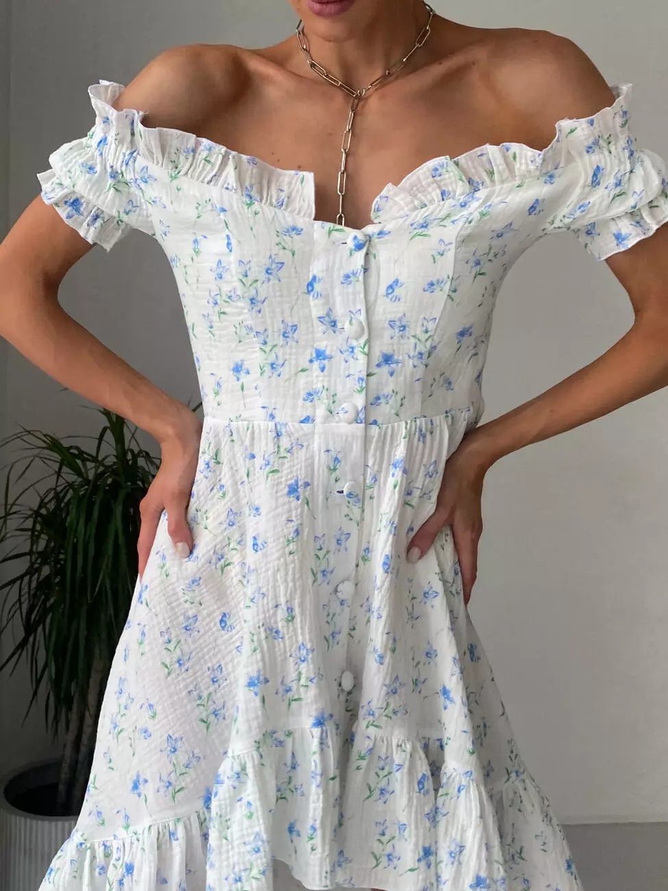 Ніжна сукня MIRANDA в романтичному стилі з відкритими плечима з легкої бавовни, що робить акцент на ніжках, максимально підкреслюючи жіночність.