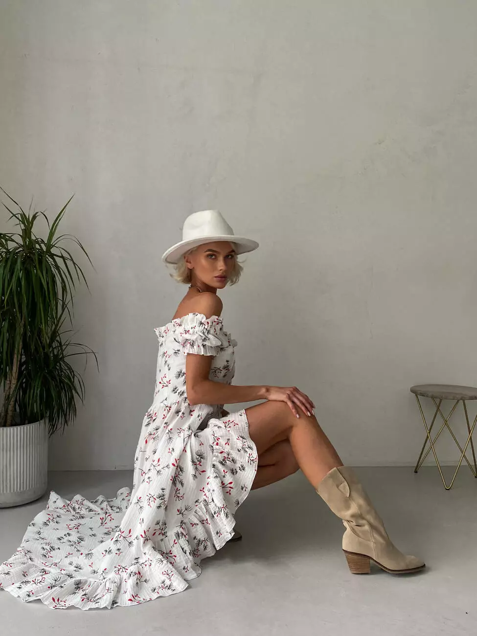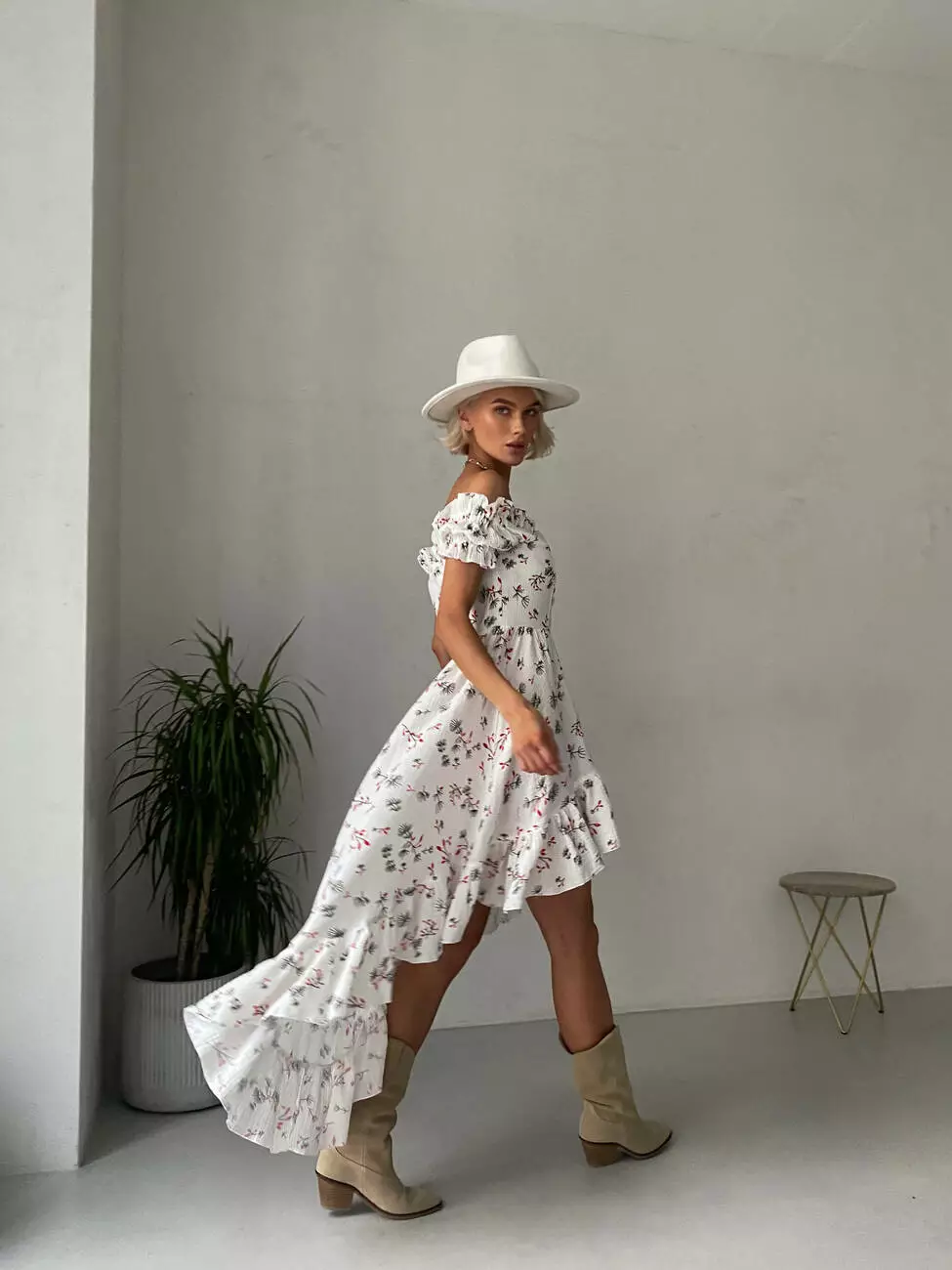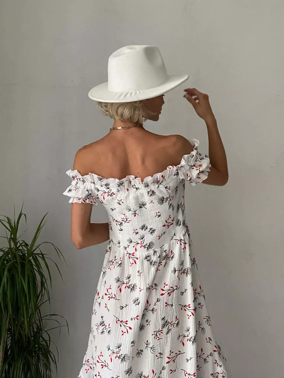 Ніжна сукня MIRANDA в романтичному стилі з відкритими плечима з легкої бавовни, що робить акцент на ніжках, максимально підкреслюючи жіночність.