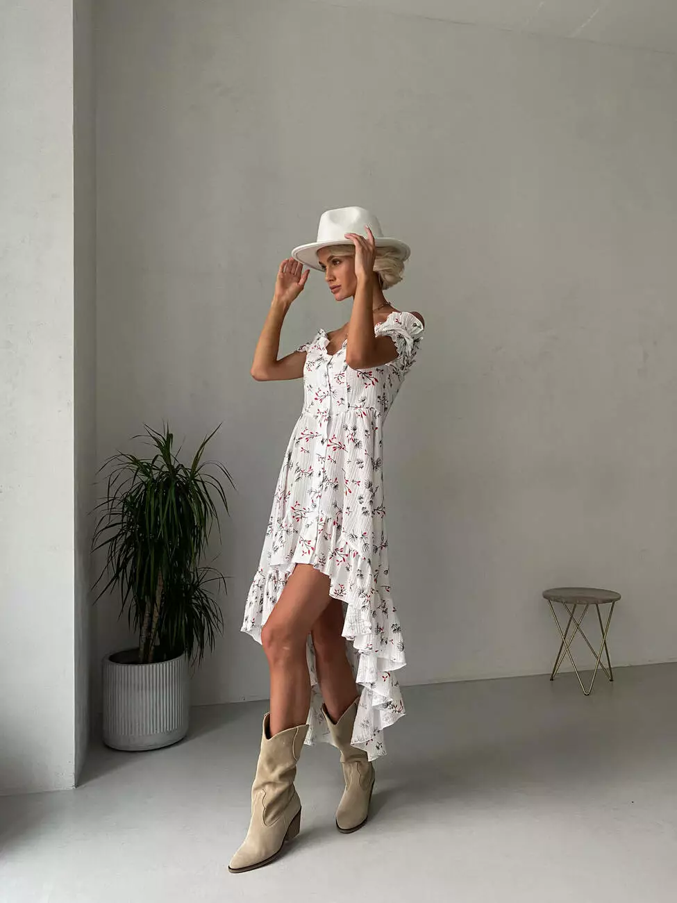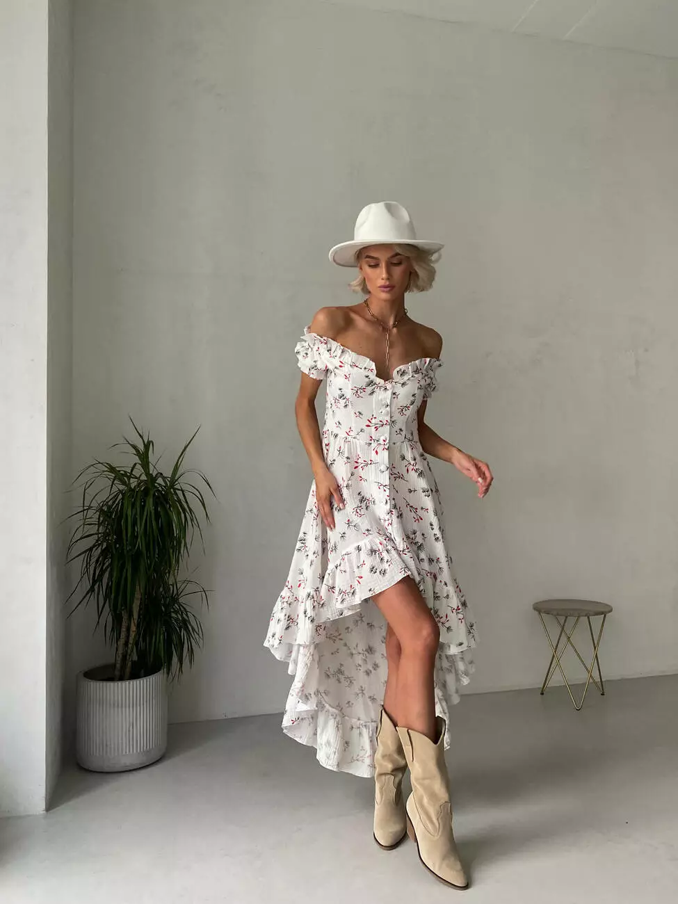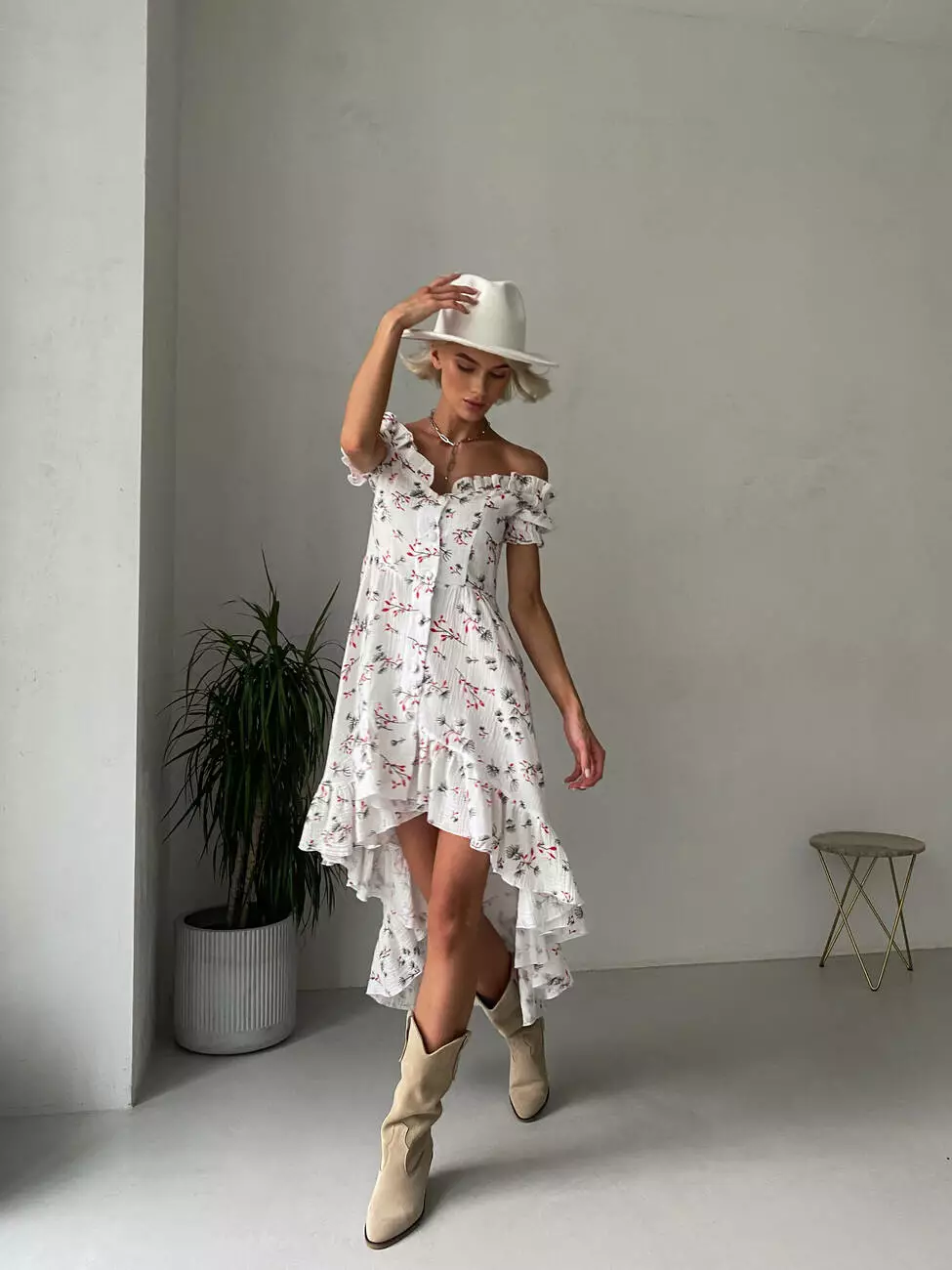 Ніжна сукня MIRANDA в романтичному стилі з відкритими плечима з легкої бавовни, що робить акцент на ніжках, максимально підкреслюючи жіночність.