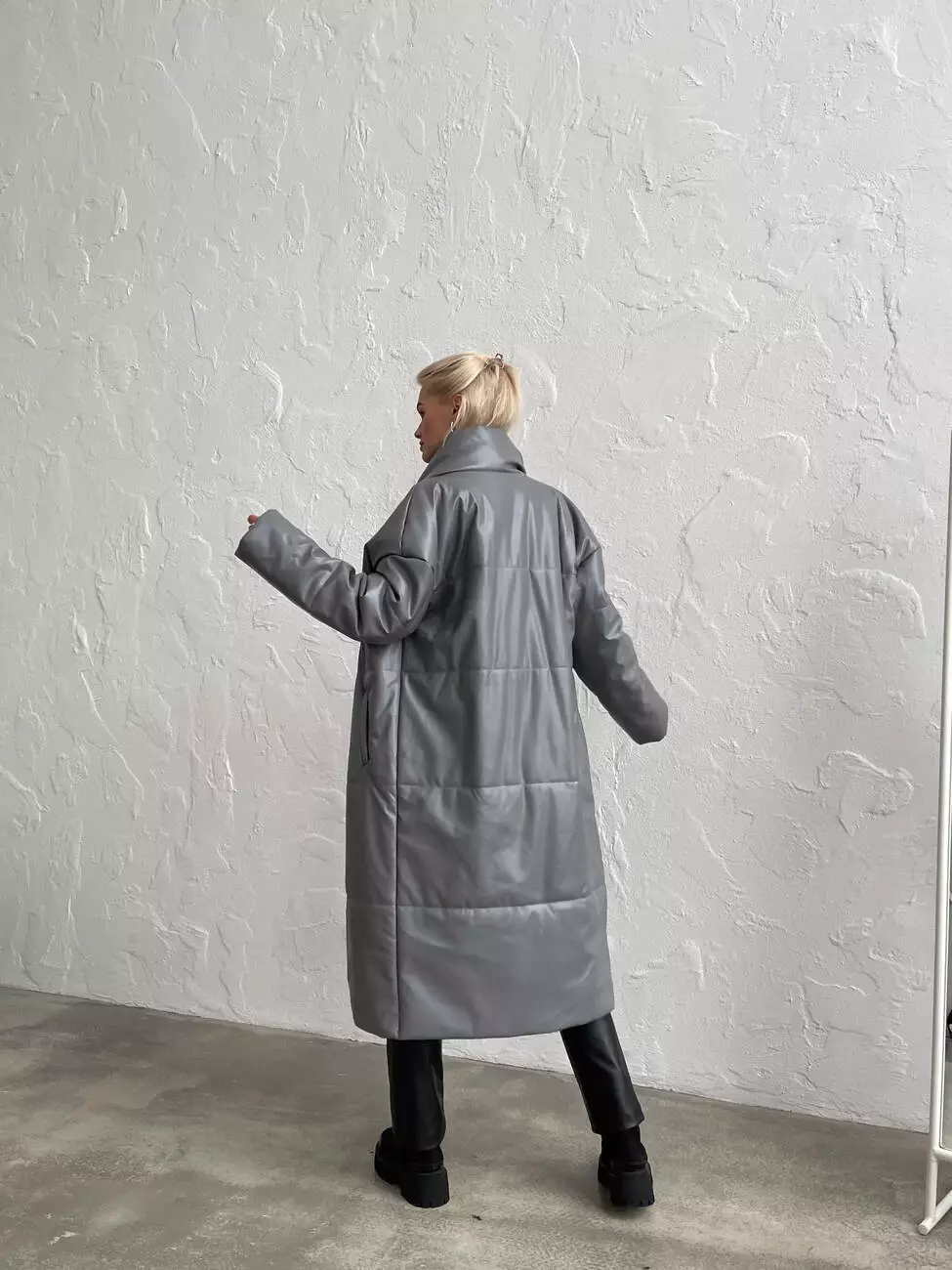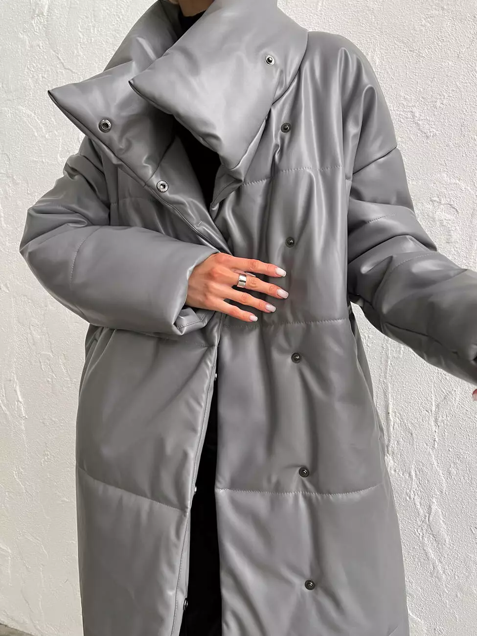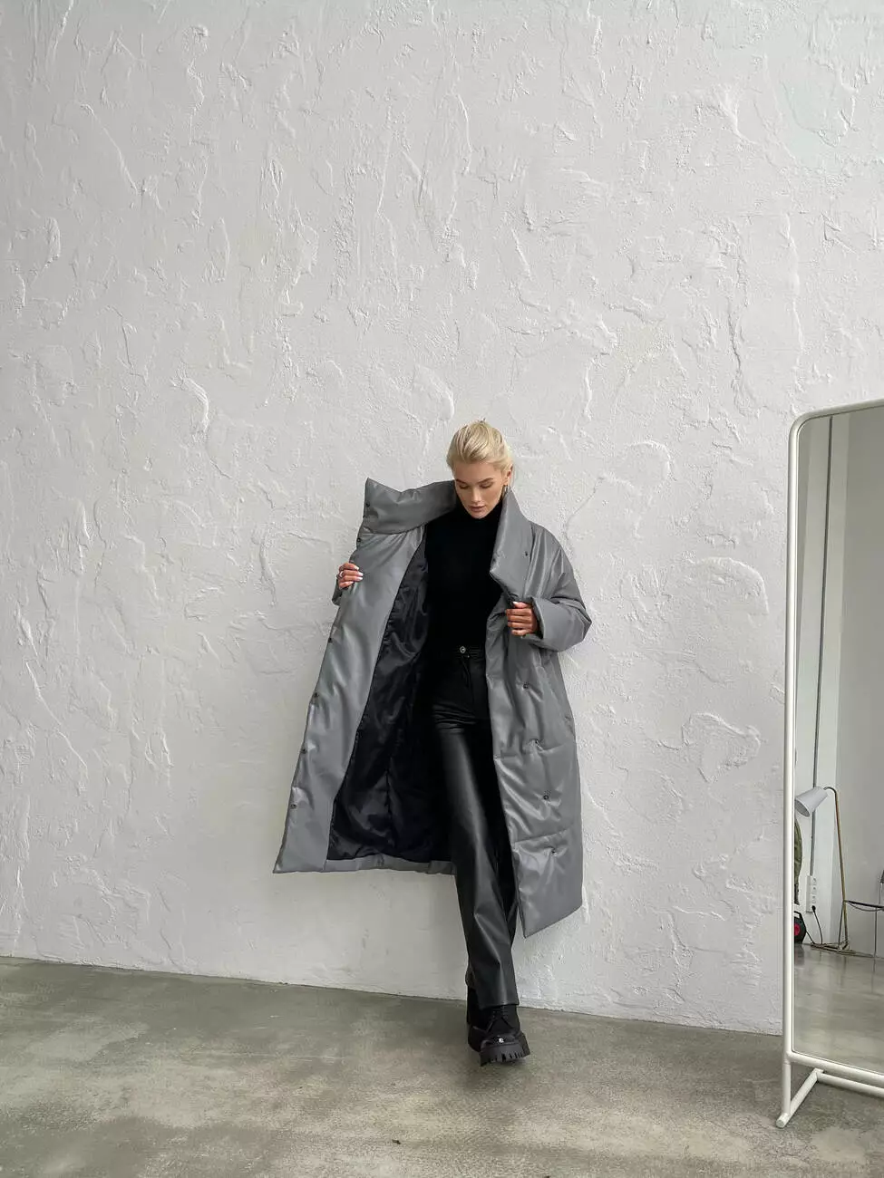 Довга жіноча зимова куртка - пуховик NIKA з екошкіри класу Lux на силіконі 200 без капюшона сірого кольору