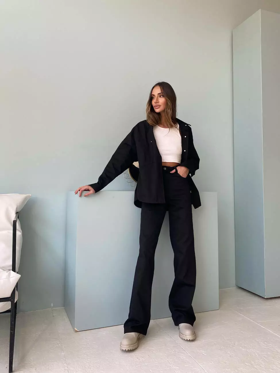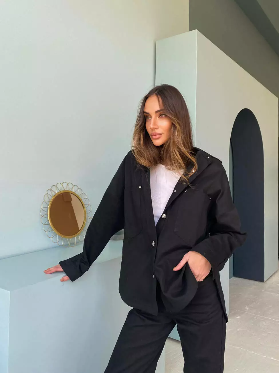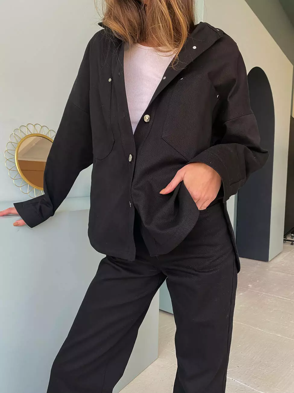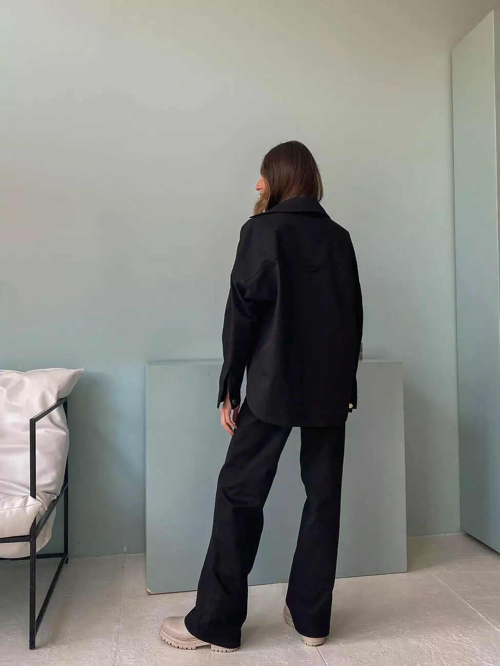 Сорочка подовжена та має дві накладні кишені, застібається на ґудзики, штани прямого крою та високої посадки.