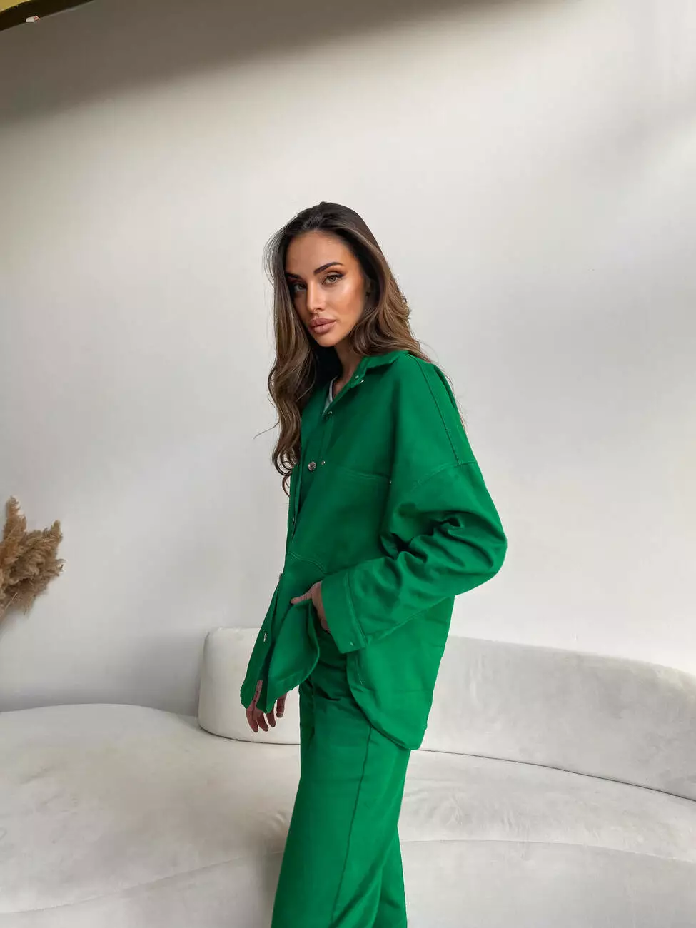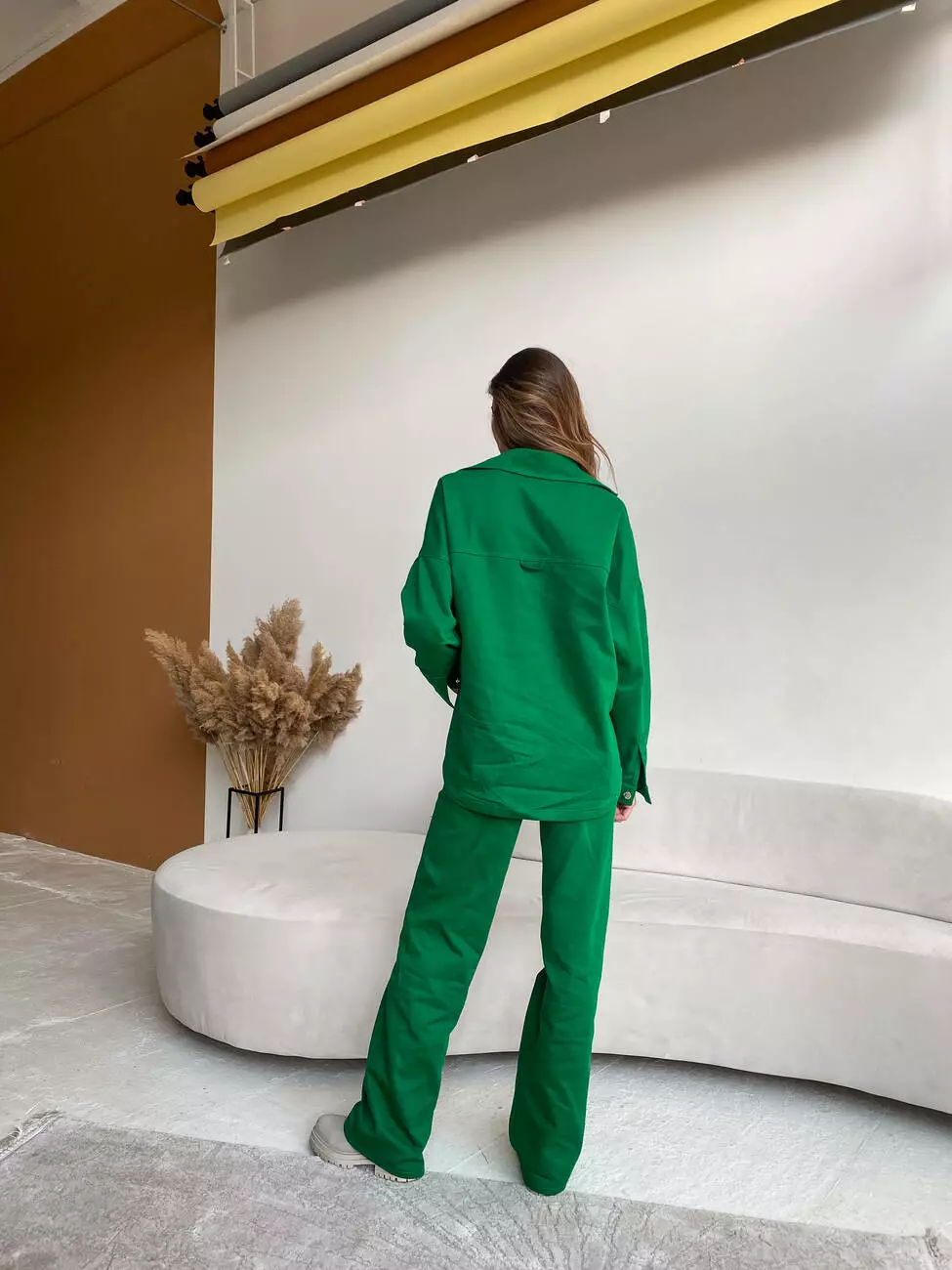 Сорочка подовжена та має дві накладні кишені, застібається на ґудзики, штани прямого крою та високої посадки.