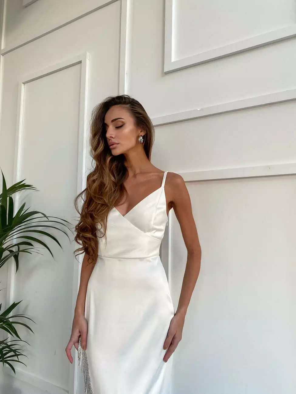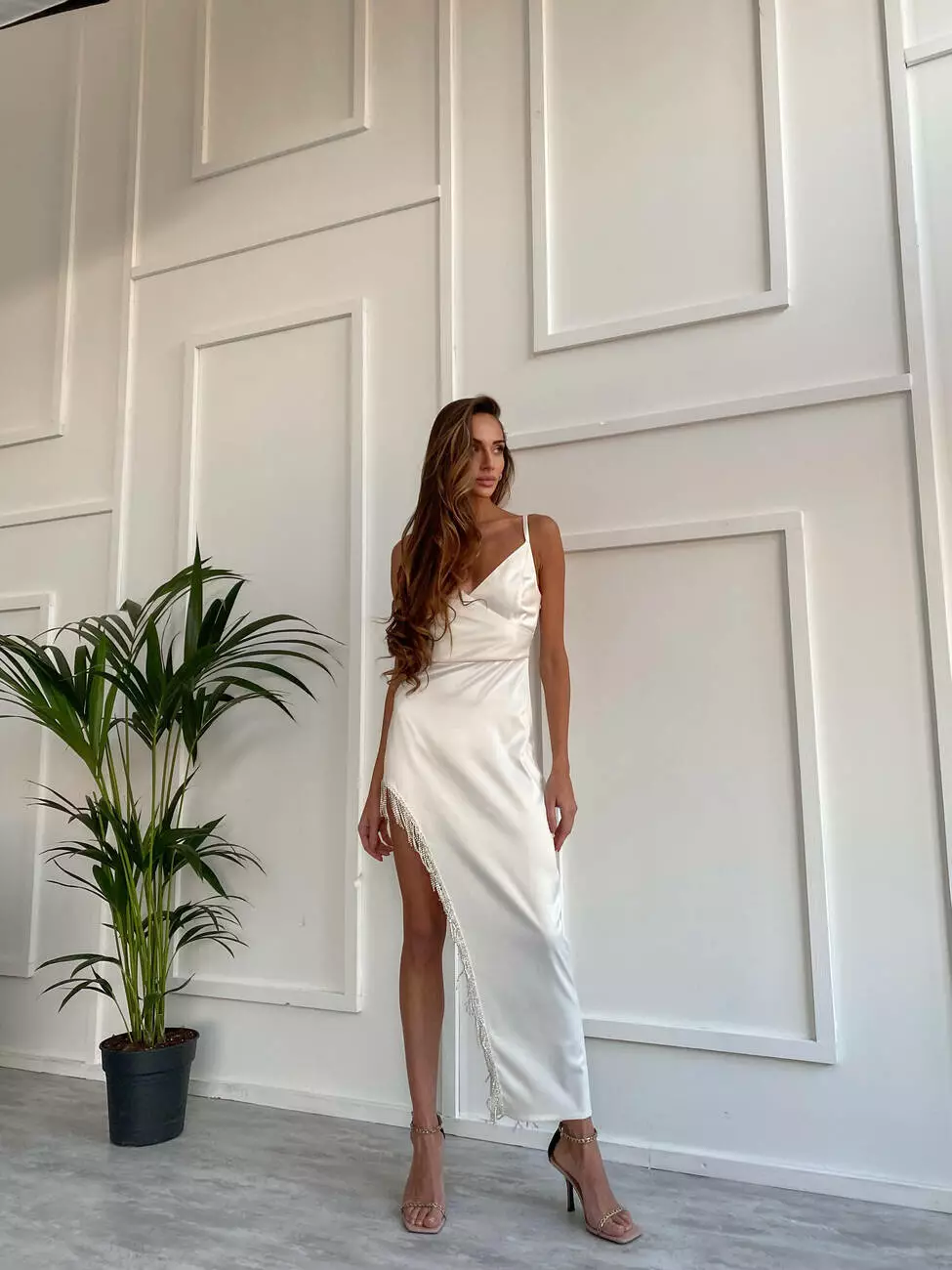 Ефектна сукня CALYPSO з королівского атласу та бахромою зі страз молочного кольору