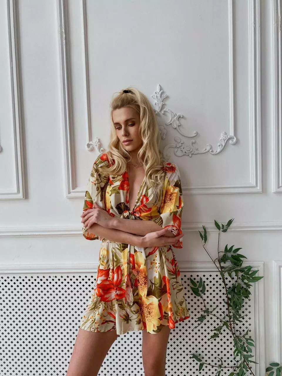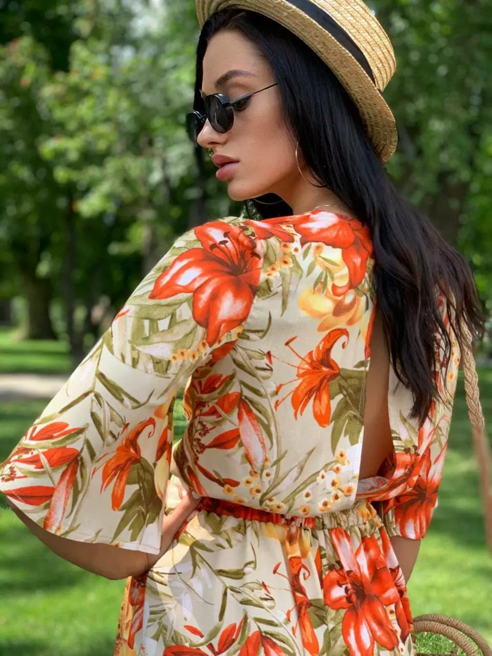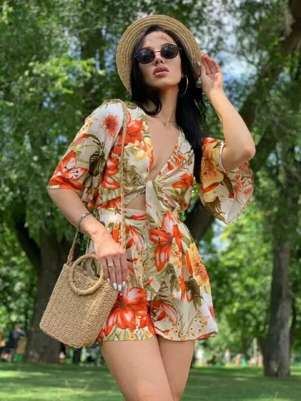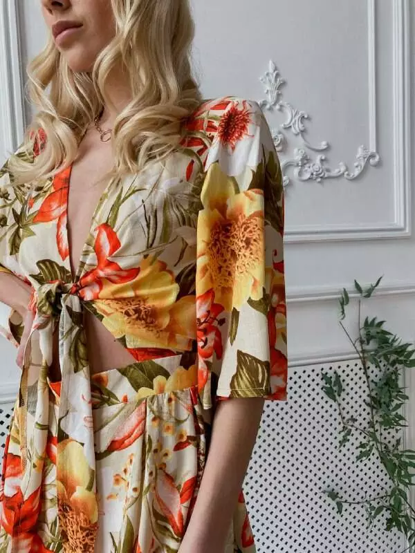 Літній, круїзний комбінезон шорти виконаний з дуже легких тканин, повітряний, приємний до тіла, рукава 3/4 кльош, перед на зав'язці, спинка з імітацією вертикального розрізу