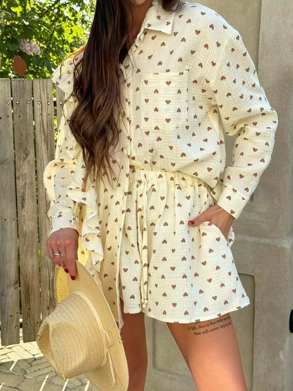 Сорочка вільного крою з довгим рукавом та шортики на гумці, з кишенями.