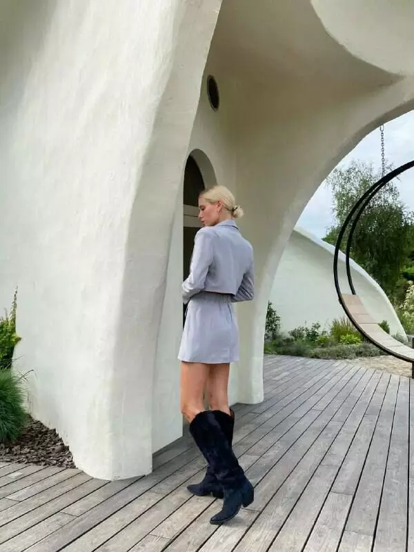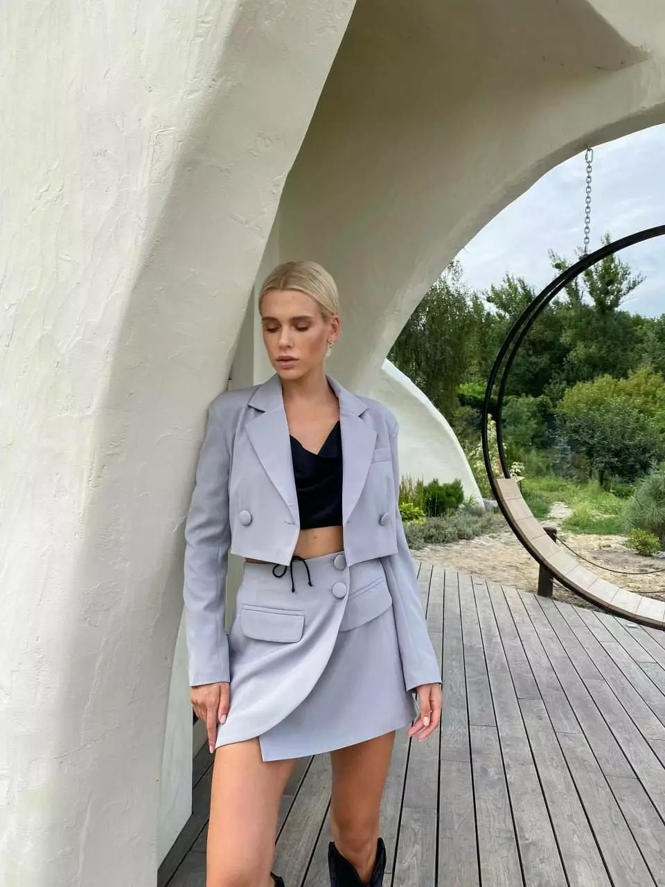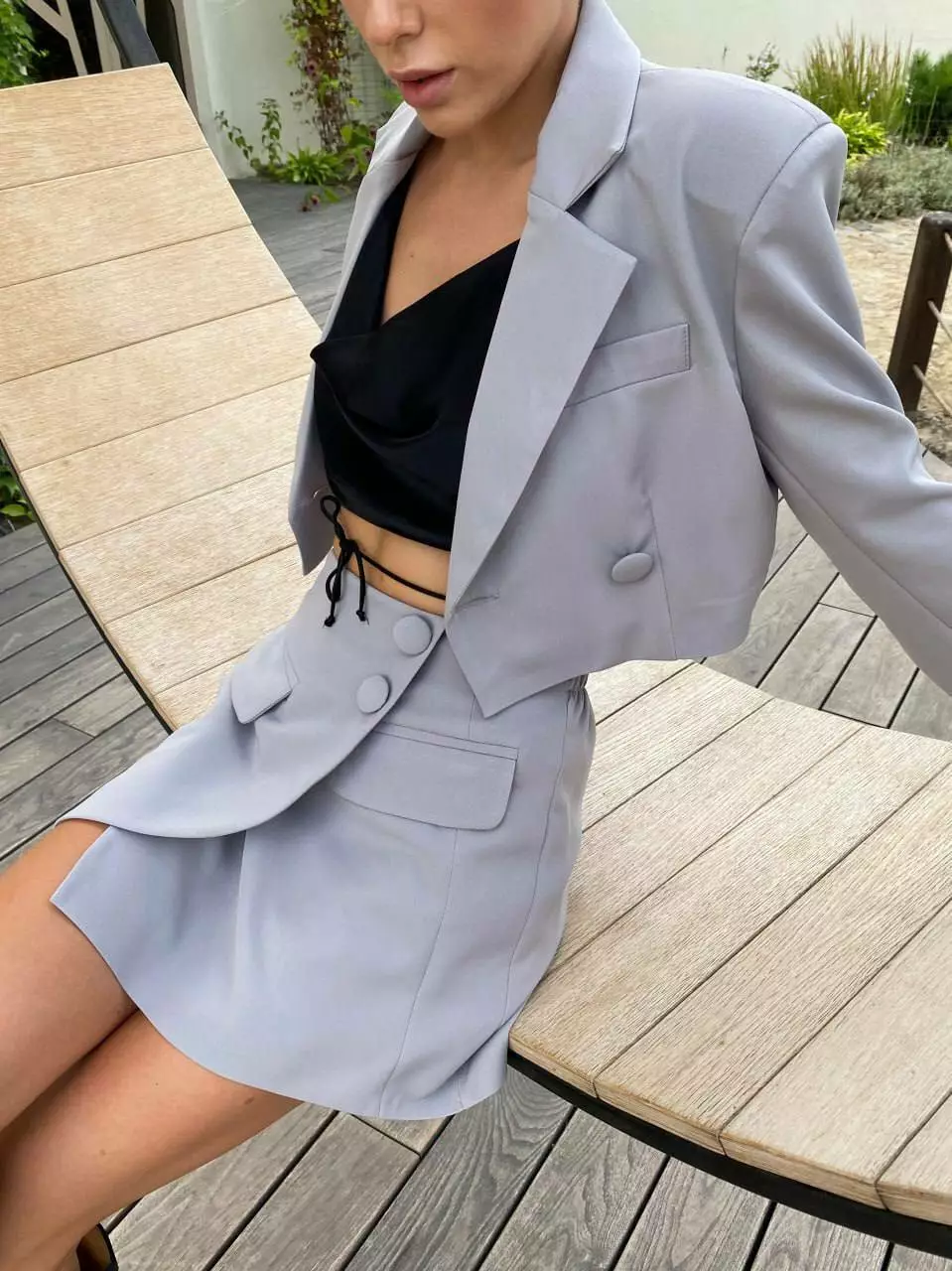 У люксовому виконанні Кроп-жакет двобортний та спідниця з імітацією запах з невеликим розрізом