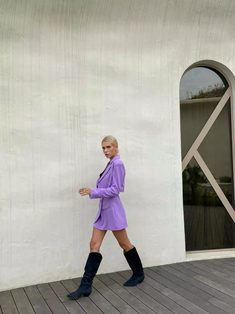 У люксовому виконанні Кроп-жакет двобортний та спідниця з імітацією запах з невеликим розрізом