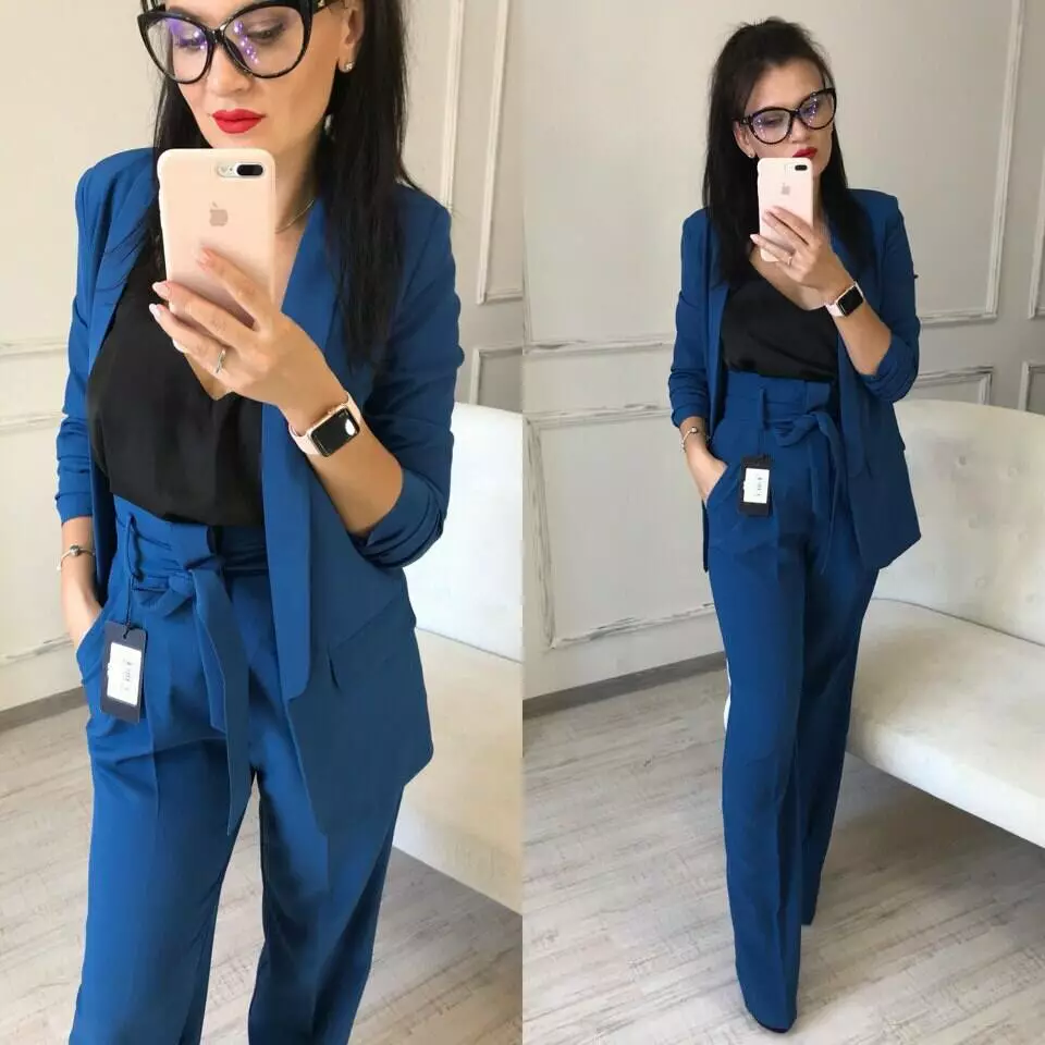 Стильний класичний костюм з тендовими штанами-трубами високої посадки та дуже ефектним піджаком з рукавами 3/4