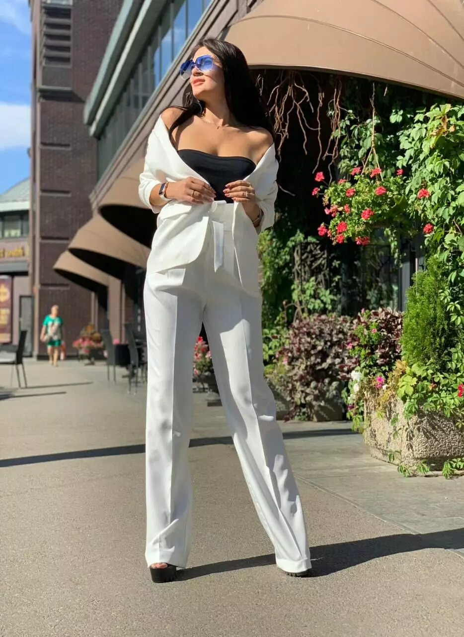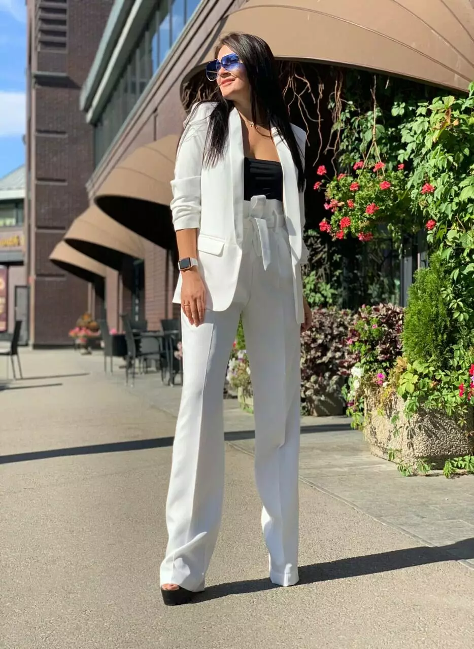 Стильний класичний костюм з тендовими штанами-трубами високої посадки та дуже ефектним піджаком з рукавами 3/4