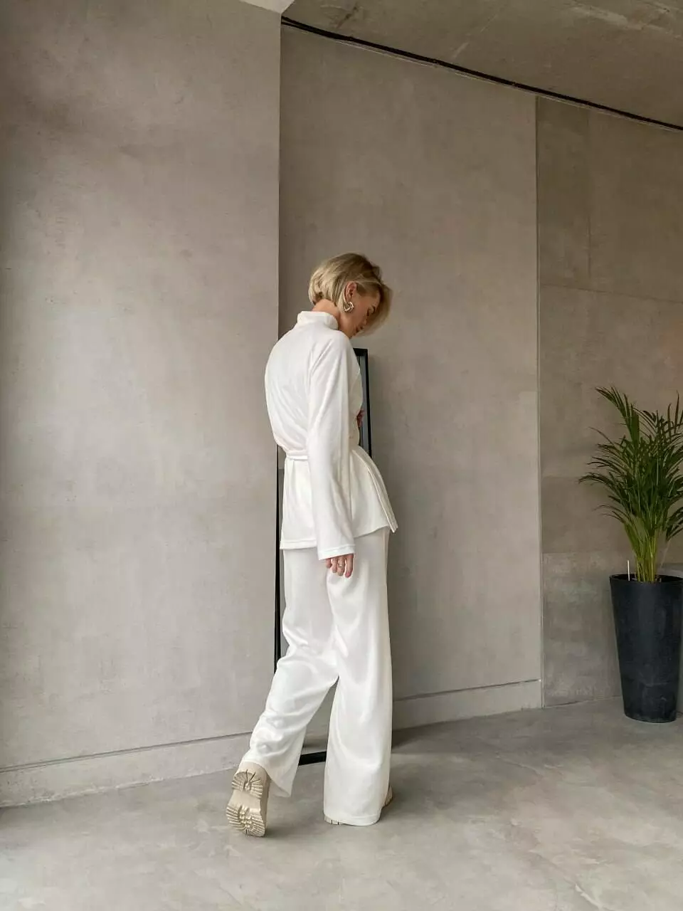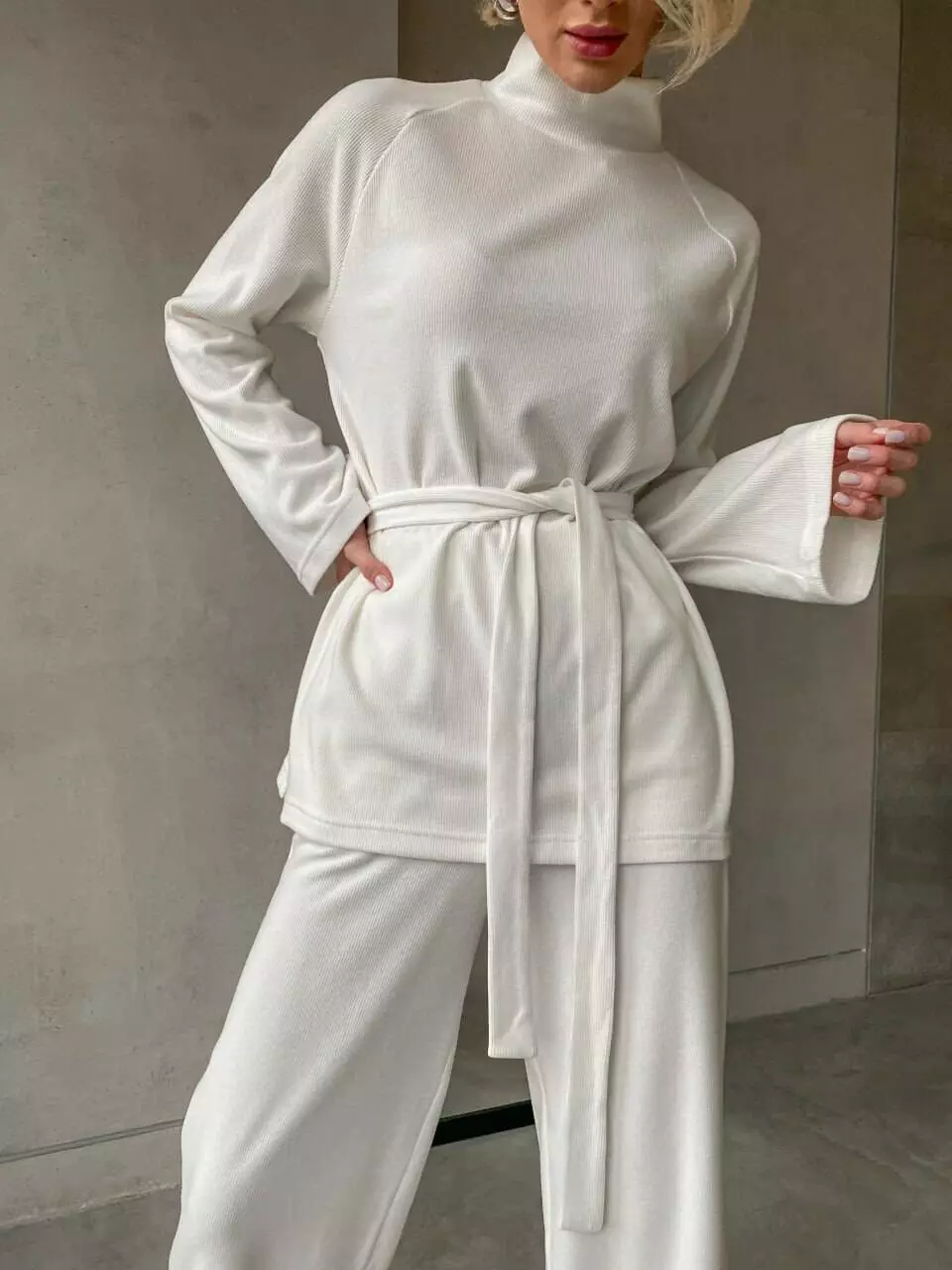 Виріб має пояс в тон, штани високої посадки та прямого крою на еластичній гумці, кофта з горлом, широка, з двома розрізами з боків