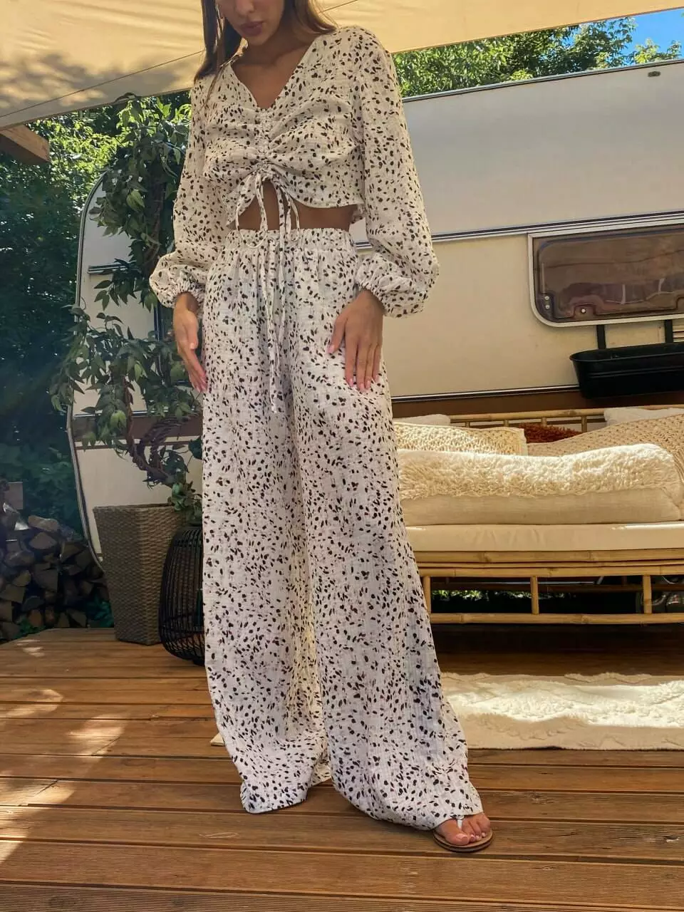 Широкі рукави, топ по переду на зав'язці Штани прямі, широкі