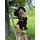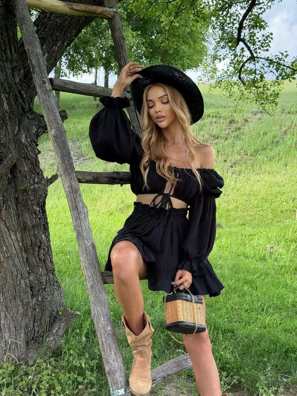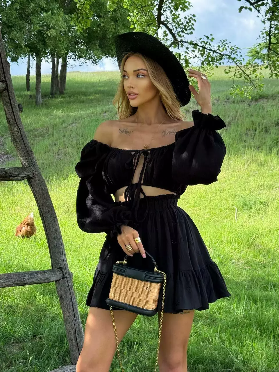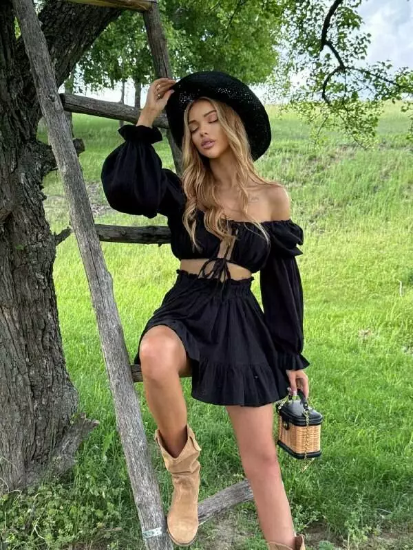 Трендовий костюм з міні та ліфом Міні-Спідниця зі зборкою по низу Ліф -топ, на завʼязках які регулюються, та обʼємними рукавами. Тканина : 100% бавовна ( прошва) Колір: чорний Розмір : xs/m