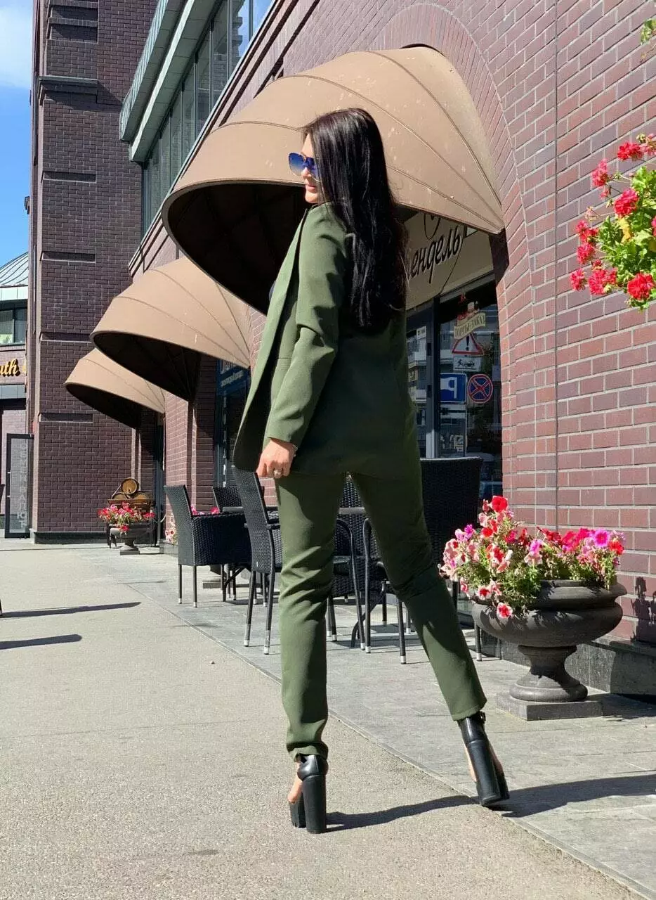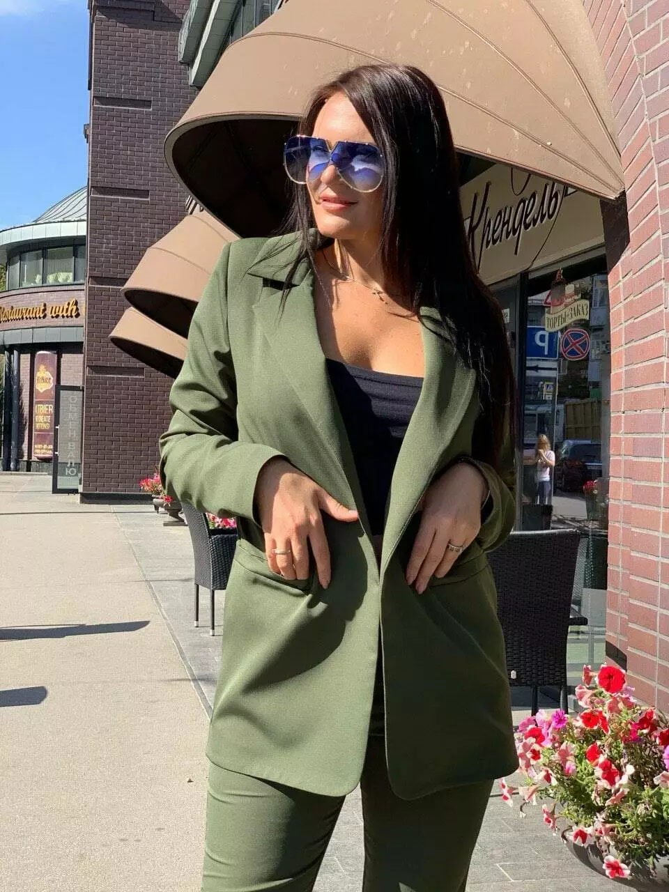 Стильний класичний костюм із тендовими штанами-дудочками високої посадки та дуже ефектним піджаком прямого крою з кишенями