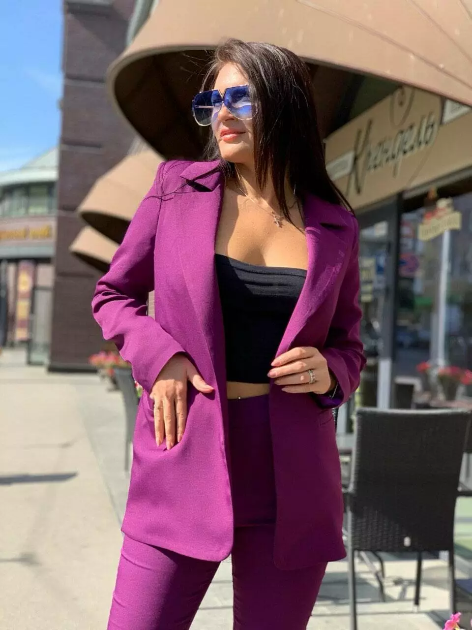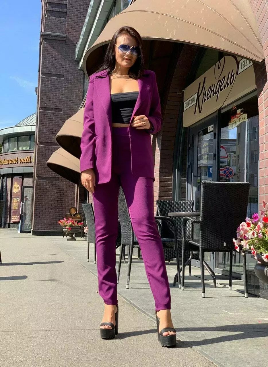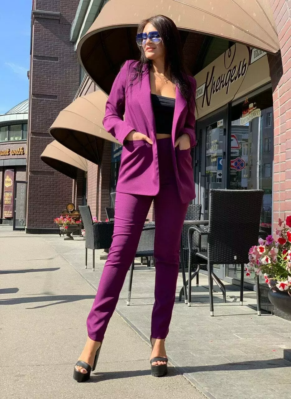 Стильний класичний костюм із тендовими штанами-дудочками високої посадки та дуже ефектним піджаком прямого крою з кишенями