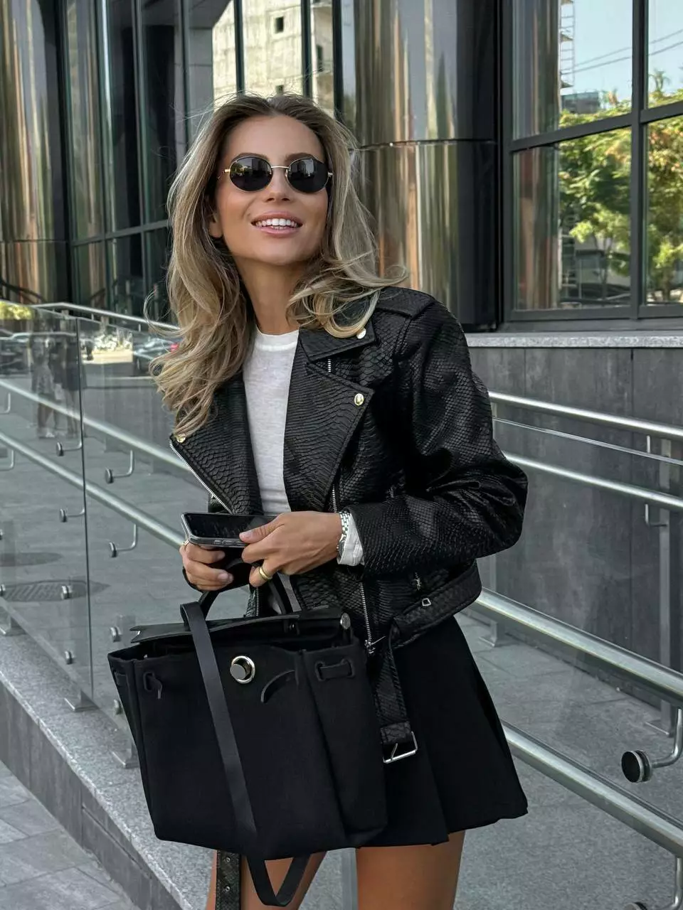 Стильна, трендова, укорочена косуха з еко-шкіри ЛЮКС якості Діючі кармани, змійки метал кольору нікель.