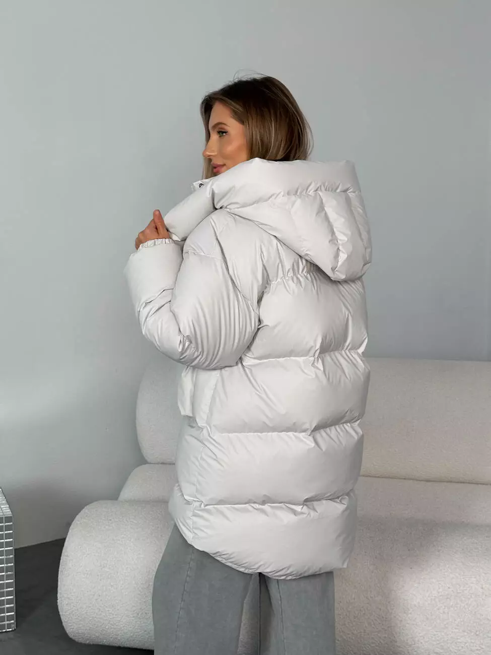 Зимовий подовжений пуховик, виконаний з плащівки на мембрані, що є непродувною і водонепроникаючою. Капюшон знімається