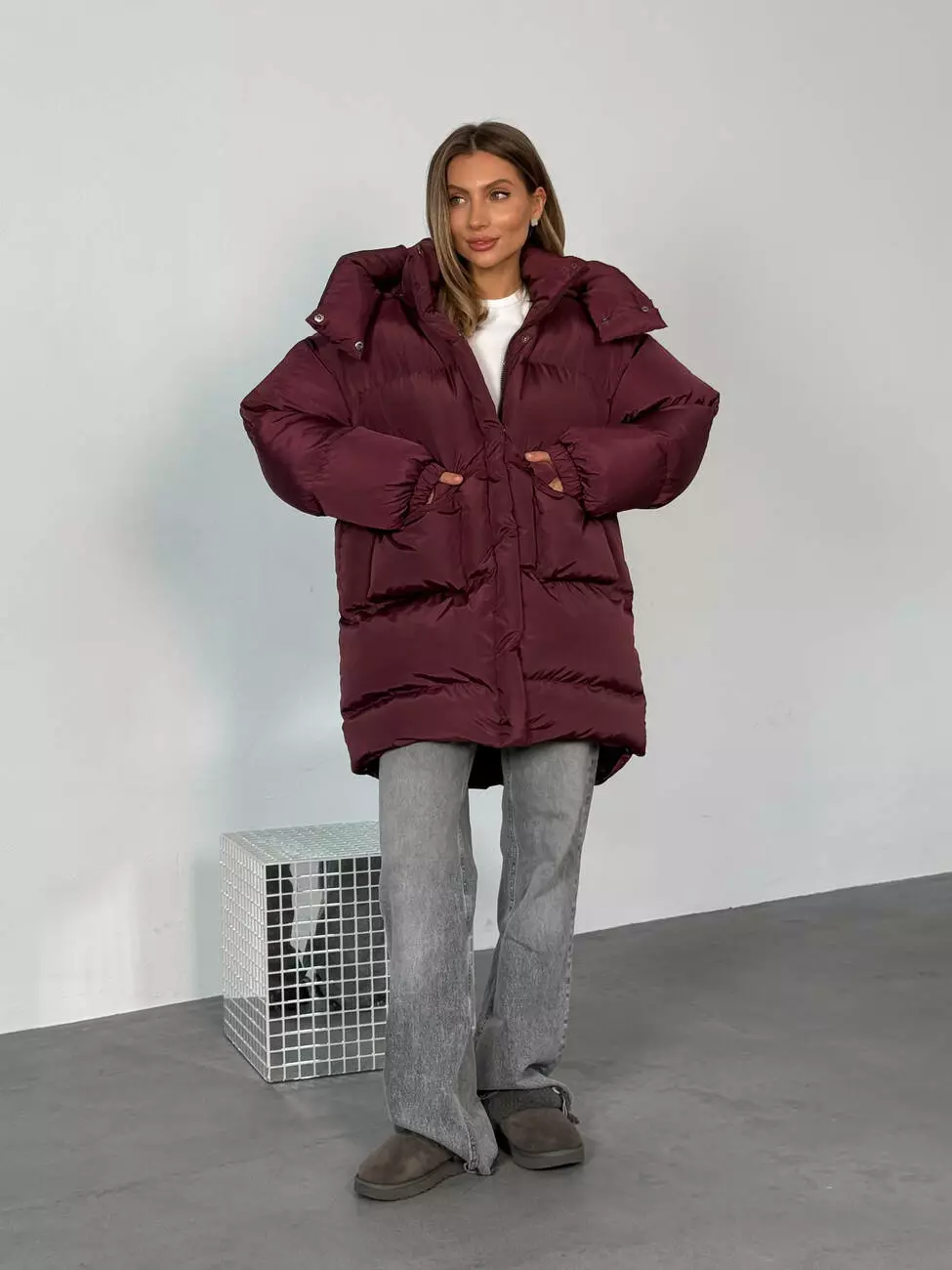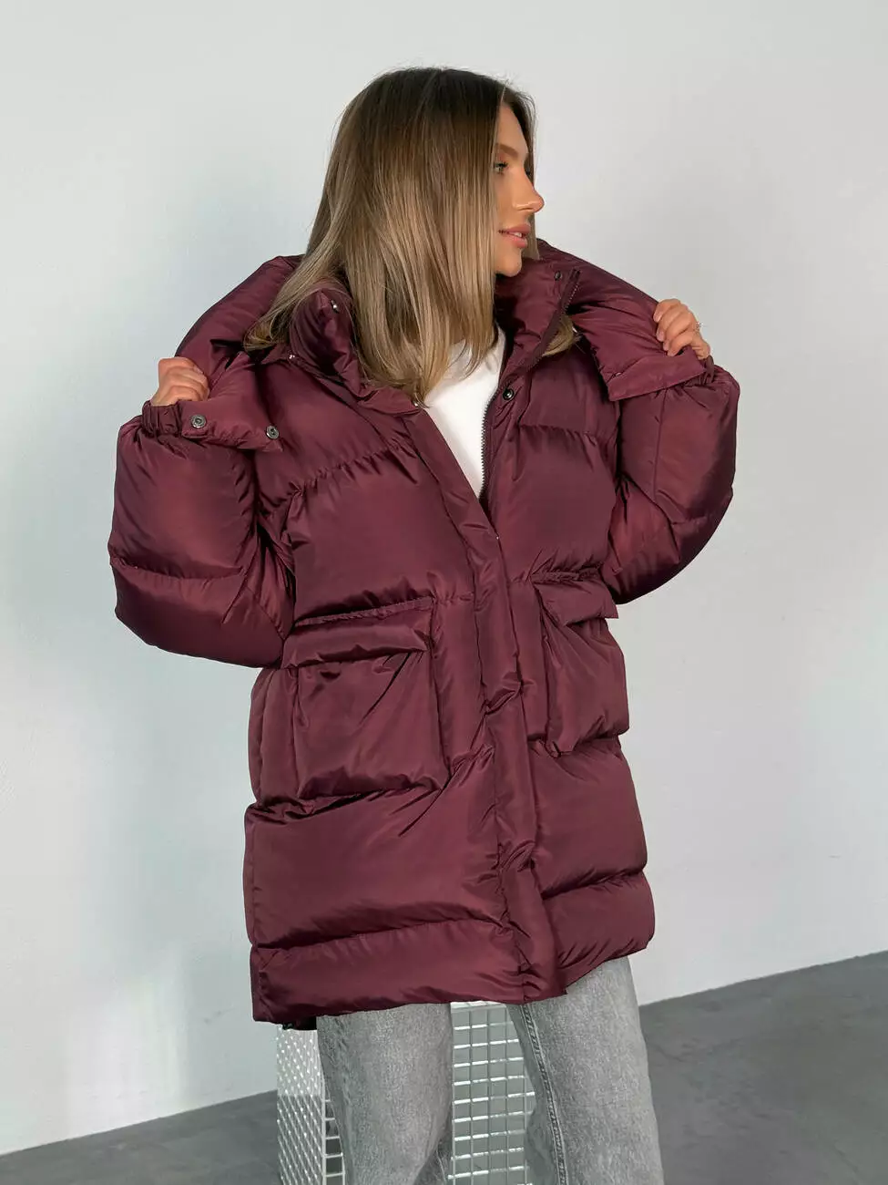 Зимовий подовжений пуховик, виконаний з плащівки на мембрані, що є непродувною і водонепроникаючою. Капюшон знімається