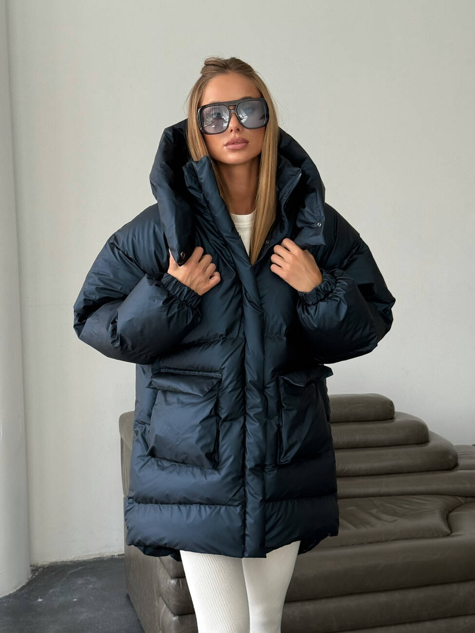 Зимовий подовжений пуховик, виконаний з плащівки на мембрані, що є непродувною і водонепроникаючою. Капюшон знімається
