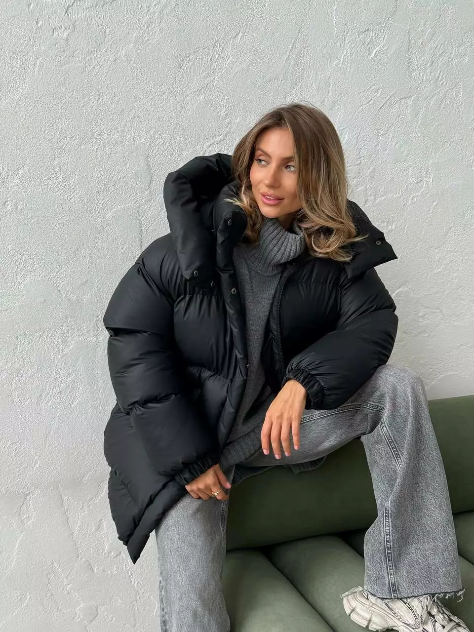 Зимовий подовжений пуховик, виконаний з плащівки на мембрані, що є непродувною і водонепроникаючою. Капюшон знімається