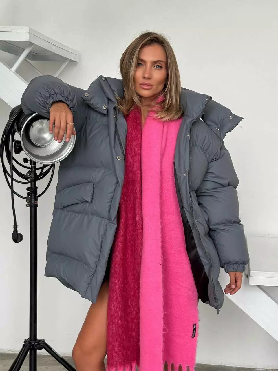 Зимовий подовжений пуховик, виконаний з плащівки на мембрані, що є непродувною і водонепроникаючою. Капюшон знімається