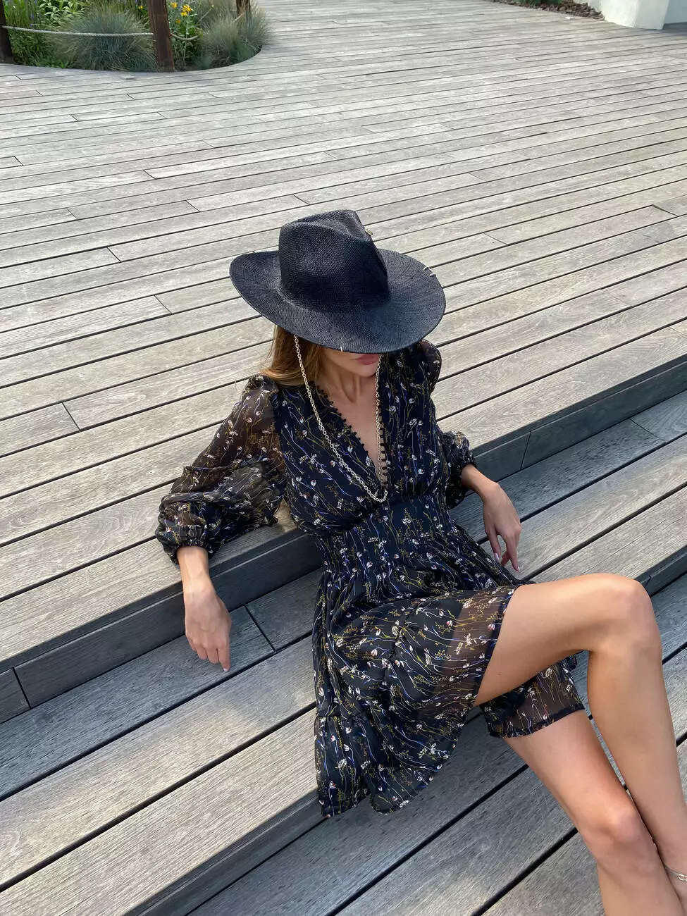 Легка та романтична сукня у квітковий принт має V-подібний виріз та довжину рукава 3/4.