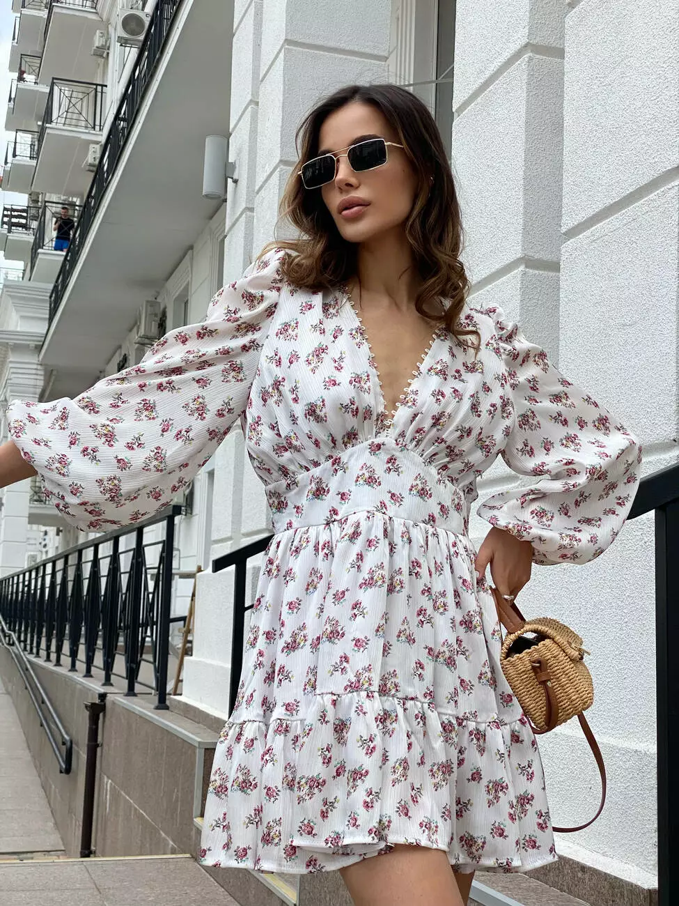 Легка та романтична сукня у квітковий принт має V-подібний виріз та довжину рукава 3/4.