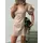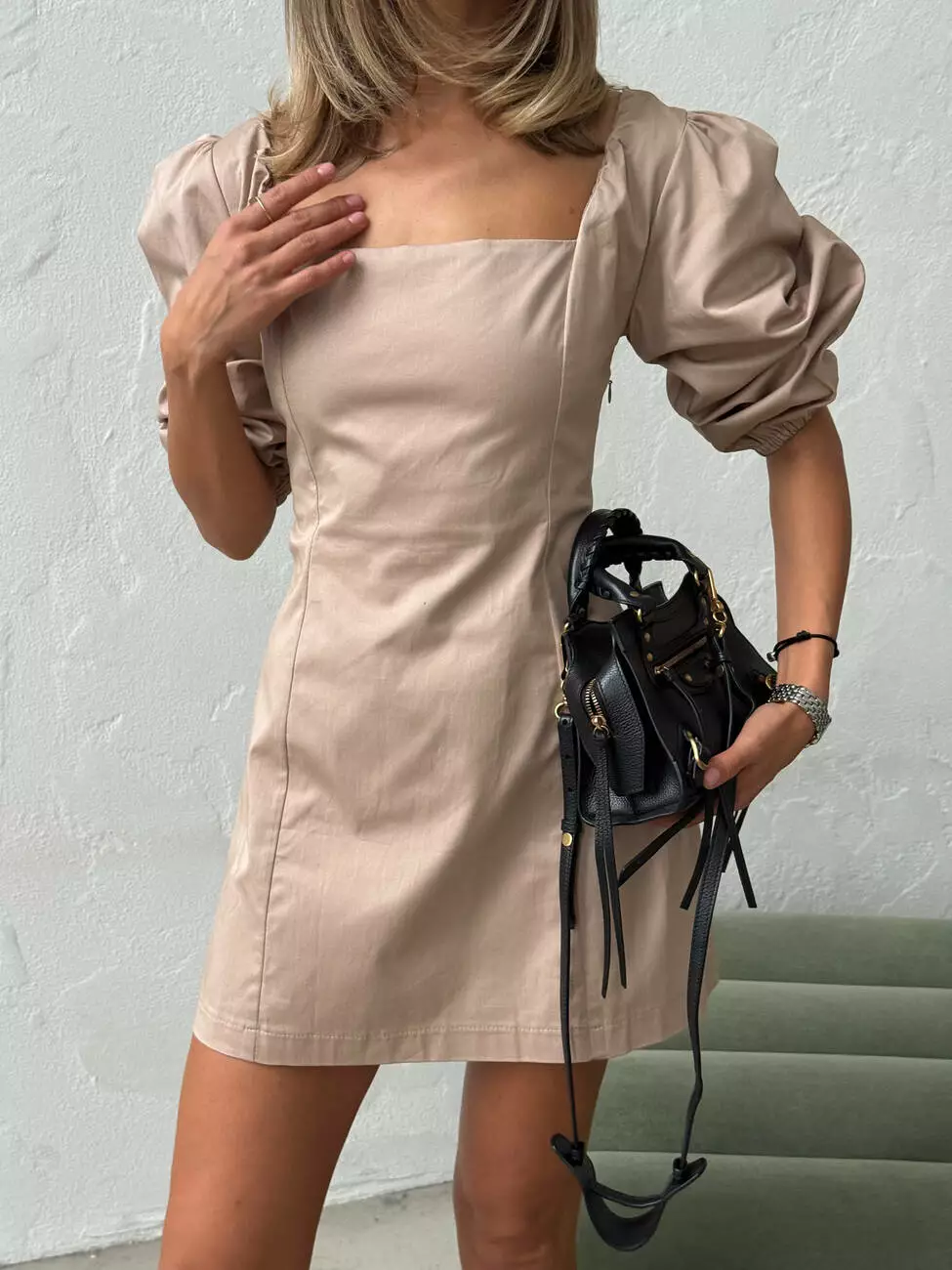 Неймовірно стильна міні сукня з котону з оригінальною спинкою. Чарівності цієї напівприлеглої моделі надають пишні рукави буфи, а також плетіння на відкритій спинці. Бежевий колір виглядає дуже актуальним, підкреслюючи трендовість моделі.
