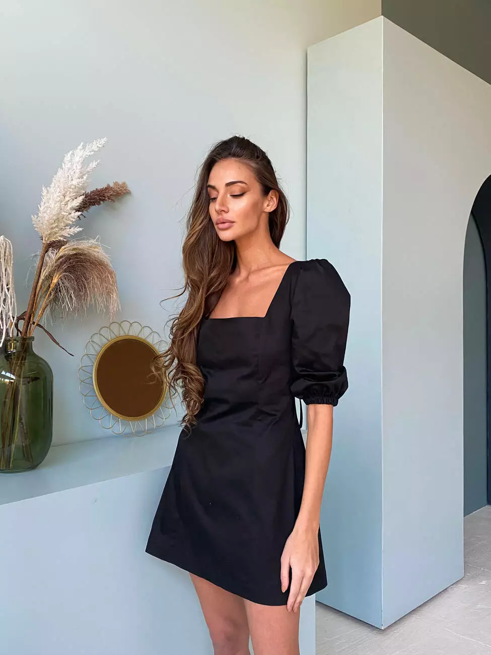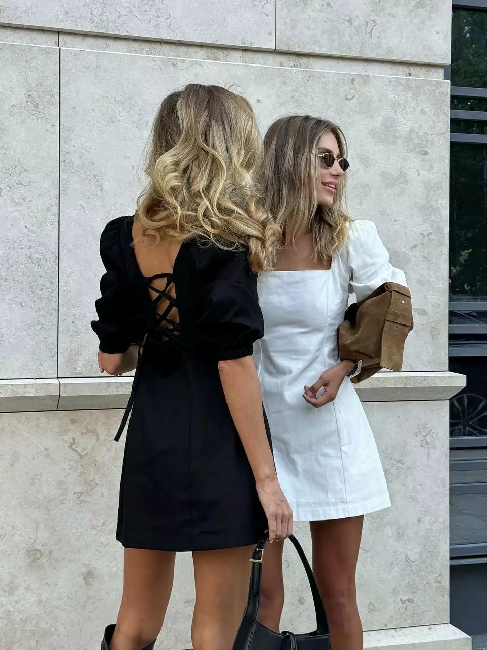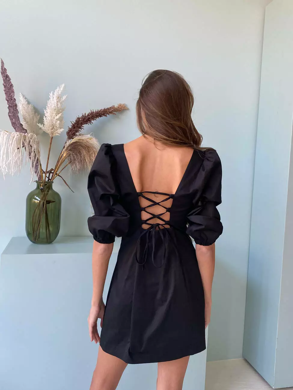 Неймовірно стильна міні сукня з котону з оригінальною спинкою. Чарівності цієї напівприлеглої моделі надають пишні рукави буфи, а також плетіння на відкритій спинці. Бежевий колір виглядає дуже актуальним, підкреслюючи трендовість моделі.