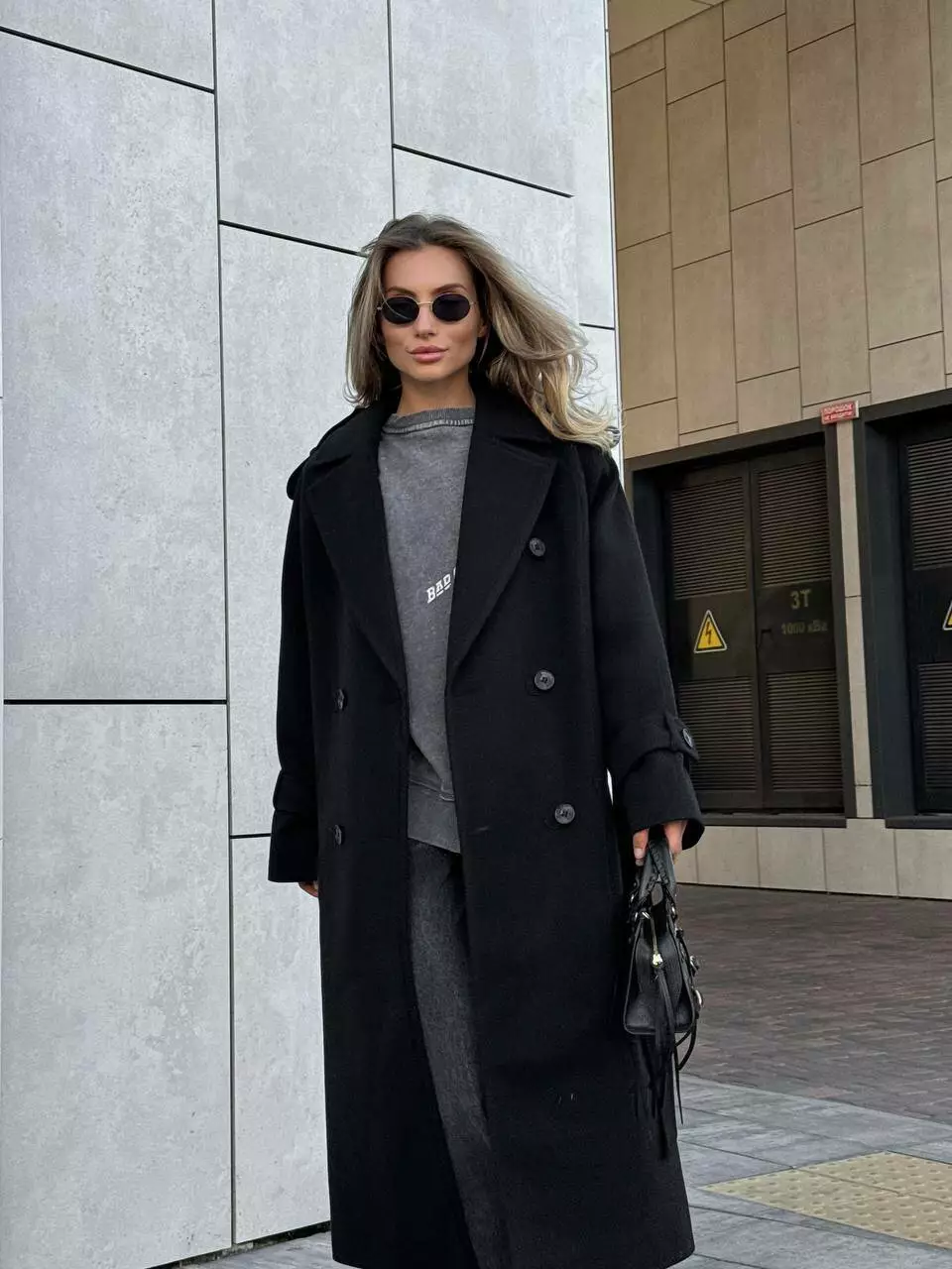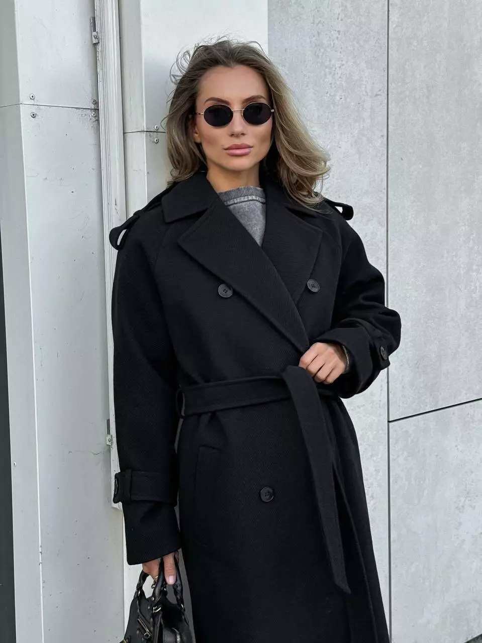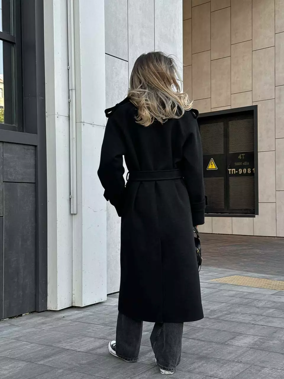 Двобортне оверсайз пальто класичного крою, декороване патами на плечах та рукавах Демісезонне пальто надає трендового об'єму, має 2 діючі кишені та шліцу по спинці внизу Застібається на гудзики, пояс в комплекті