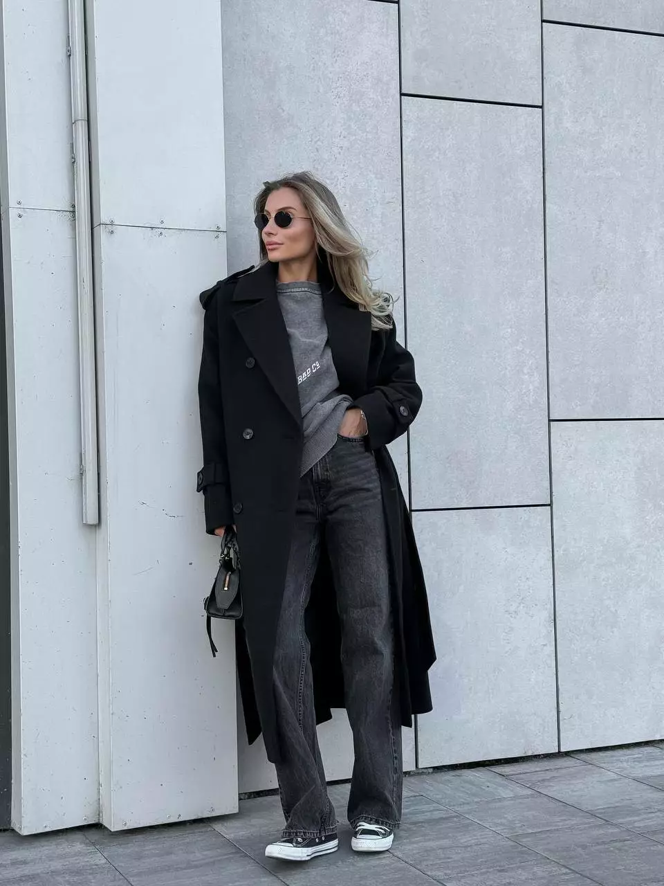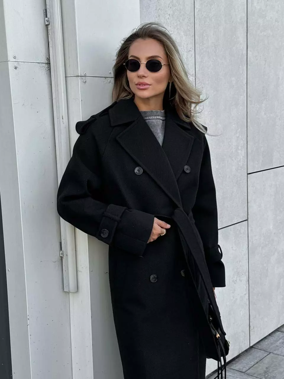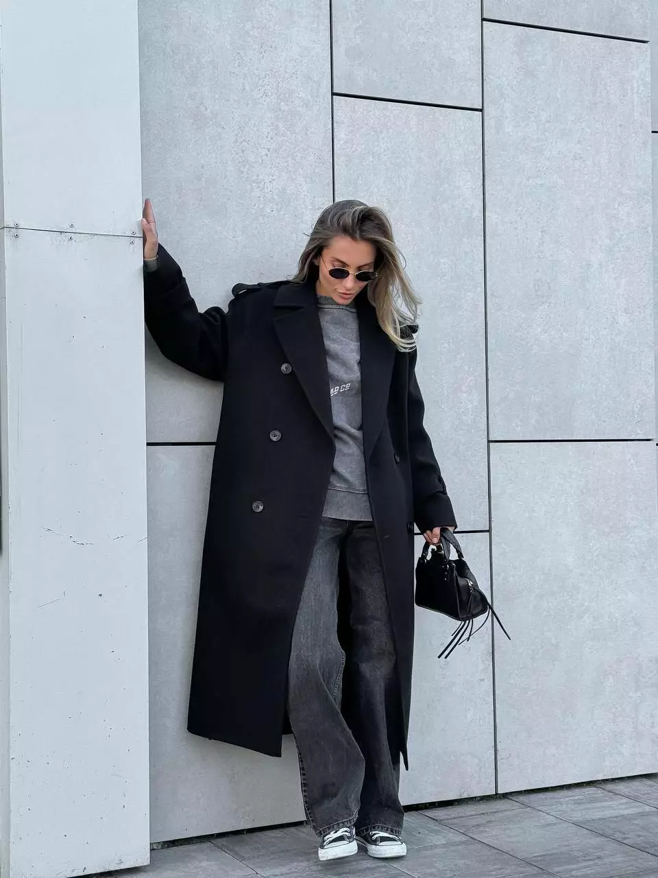 Двобортне оверсайз пальто класичного крою, декороване патами на плечах та рукавах Демісезонне пальто надає трендового об'єму, має 2 діючі кишені та шліцу по спинці внизу Застібається на гудзики, пояс в комплекті