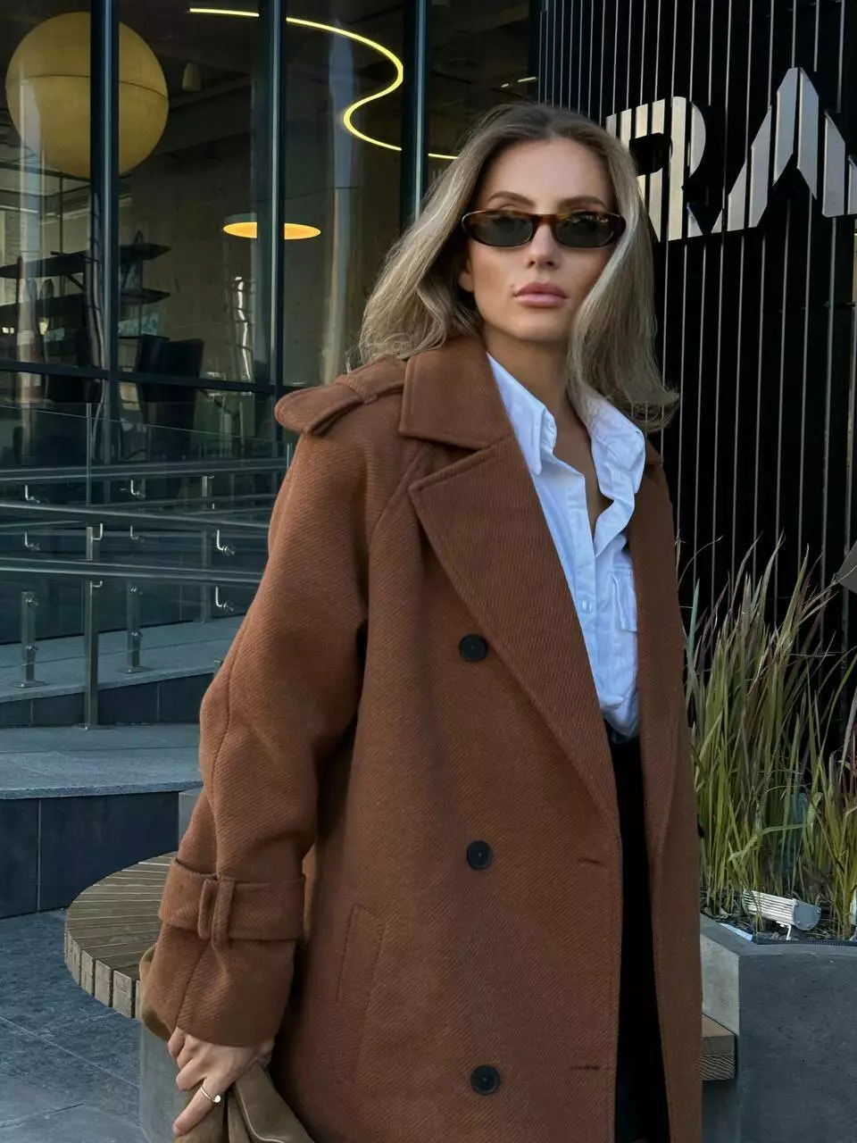 Двобортне оверсайз пальто класичного крою, декороване патами на плечах та рукавах Демісезонне пальто надає трендового об'єму, має 2 діючі кишені та шліцу по спинці внизу Застібається на гудзики, пояс в комплекті