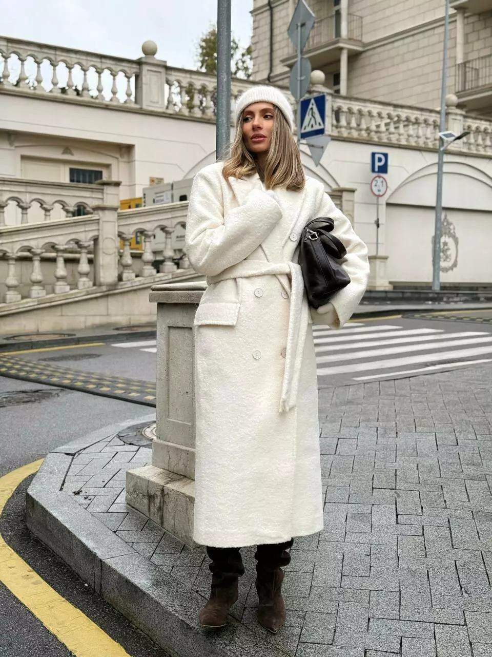 Трендове подовжене двобортне пальто класичного крою з об'ємними плечима Дизайн пальто створений, щоб відчувати себе неймовірно комфортно та впевнено у будь-якій ситуації, 2 діючі кишені та шліца по спинці внизу Застібається на гудзики, пояс в комплекті