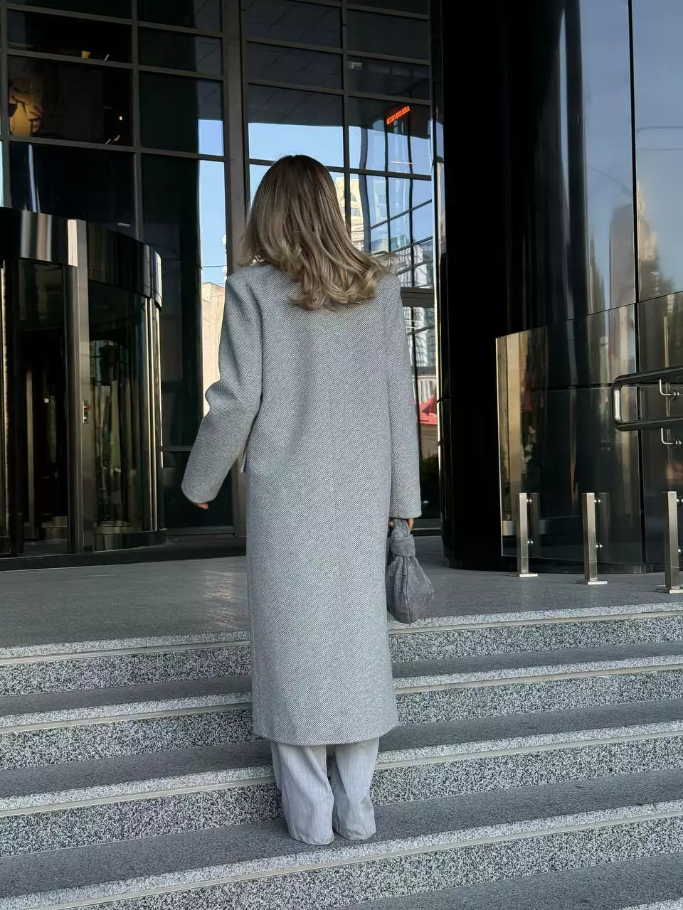 Трендове подовжене двобортне пальто класичного крою з об'ємними плечима Дизайн пальто створений, щоб відчувати себе неймовірно комфортно та впевнено у будь-якій ситуації, 2 діючі кишені та шліца по спинці внизу Застібається на гудзики, пояс в комплекті