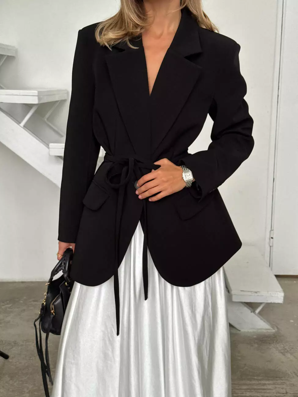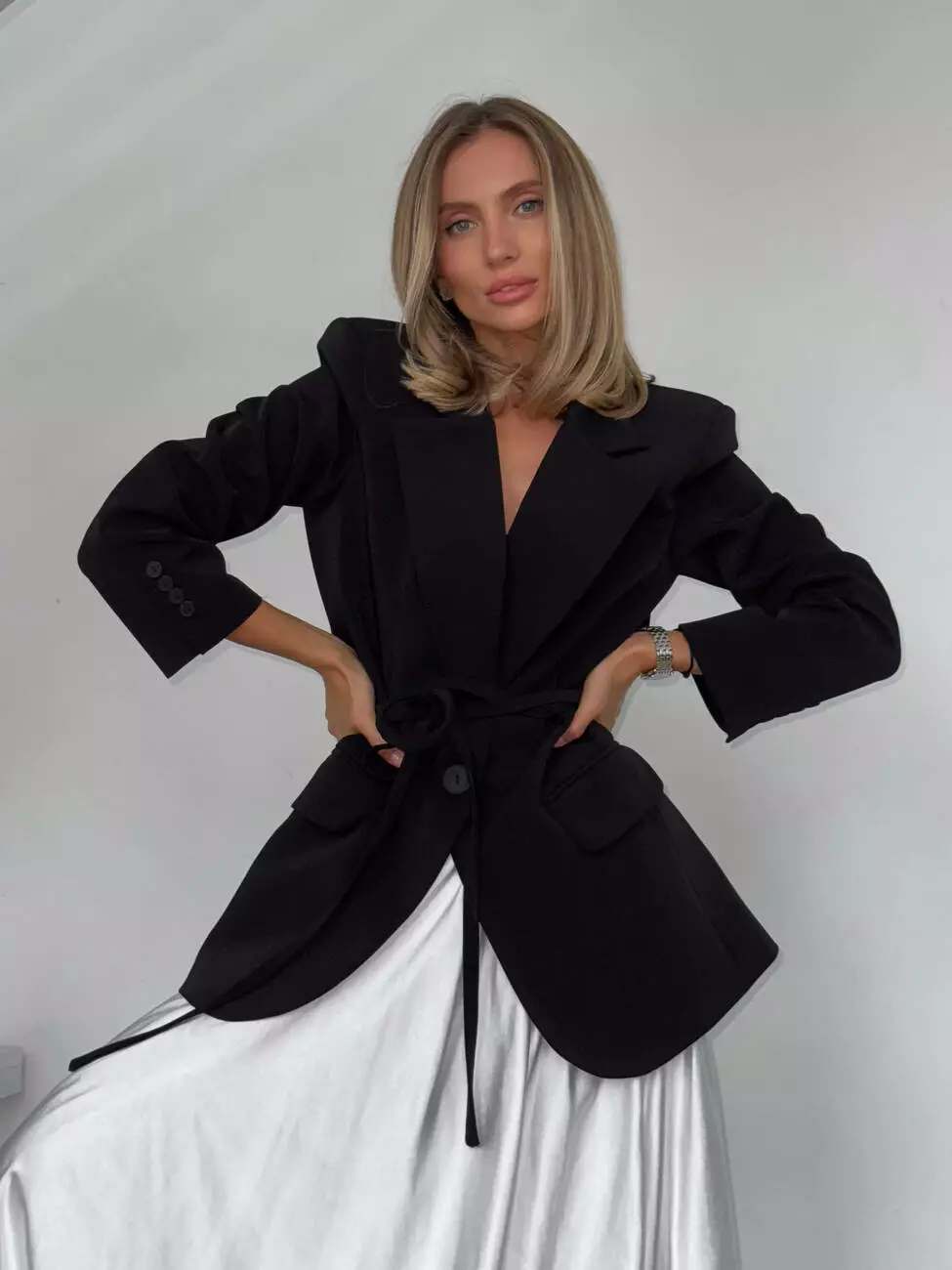 Стильний класичний піджак виконаний із преміальної костюмної тканини. Піджак прямого крою, подовжений, з обʼємними плечима і 2 діючими кармани. В комплекті тонкий пояс -шнурівка.