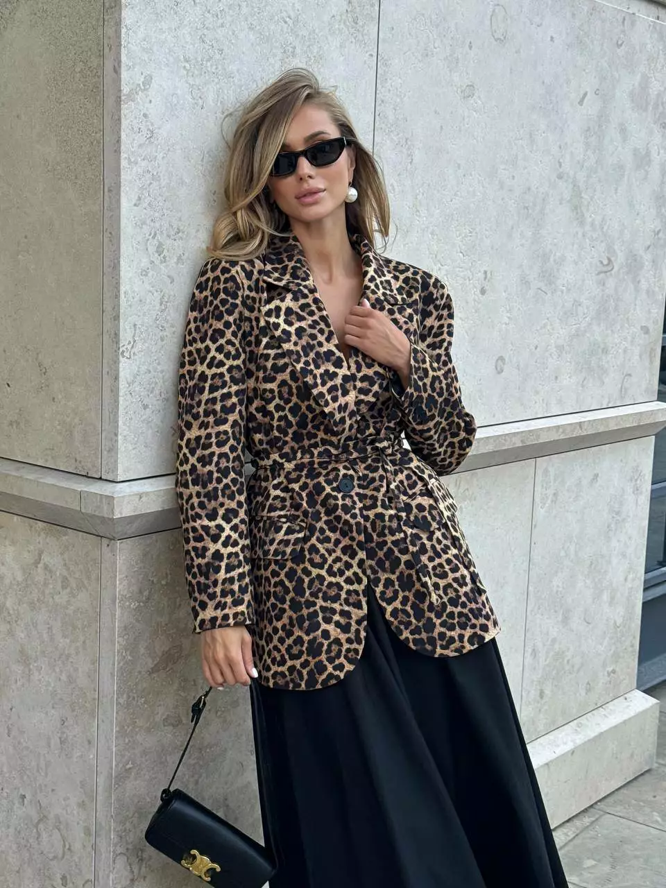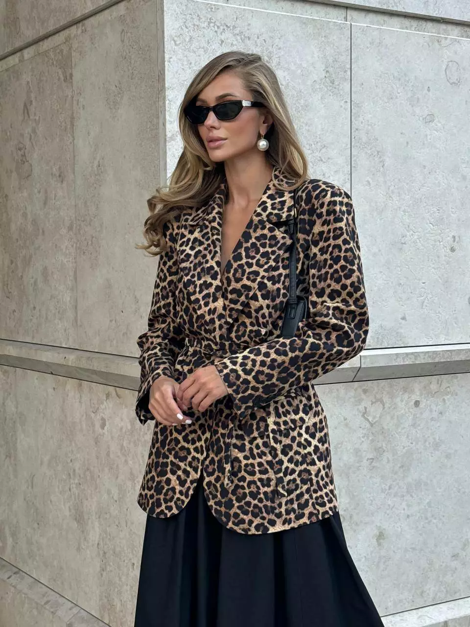 Стильний класичний піджак виконаний із преміальної костюмної тканини. Піджак прямого крою, подовжений, з обʼємними плечима і 2 діючими кармани. В комплекті тонкий пояс -шнурівка.