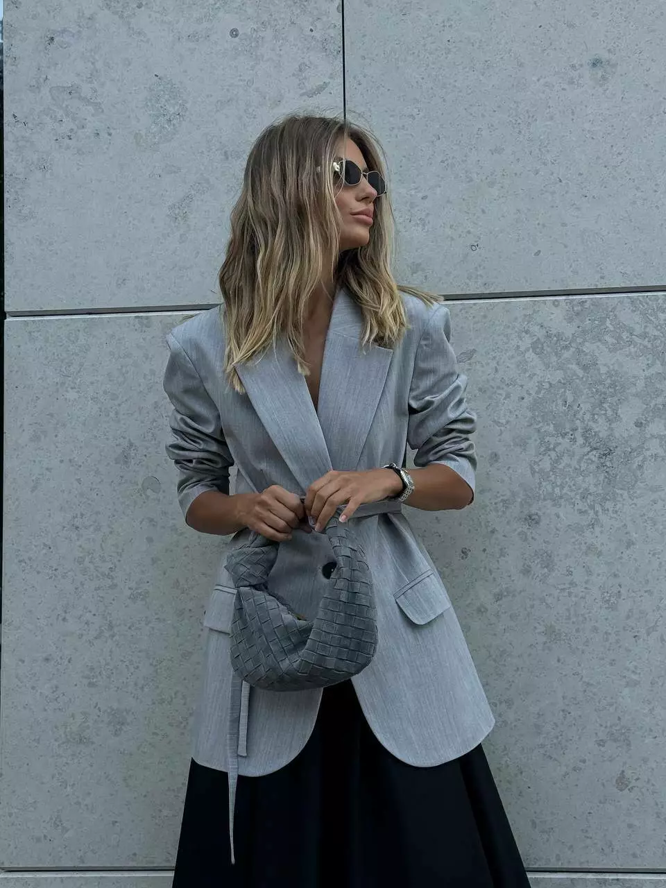 Стильний класичний піджак виконаний із преміальної костюмної тканини. Піджак прямого крою, подовжений, з обʼємними плечима і 2 діючими кармани. В комплекті тонкий пояс -шнурівка.