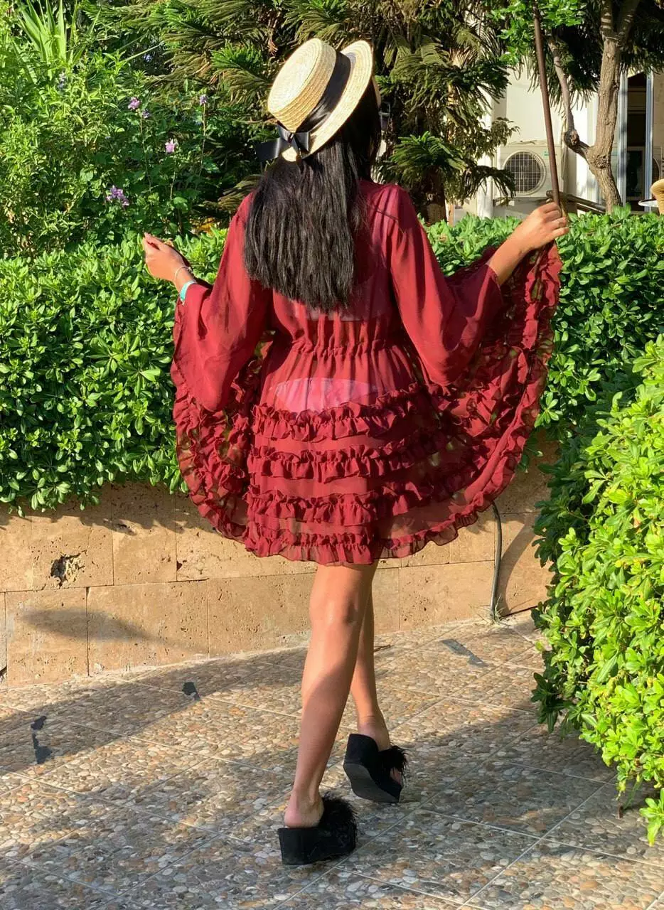 Шифоновий пляжний халат з оборками по юбці, рукав 3-4 флангом, таліч на кулісці
