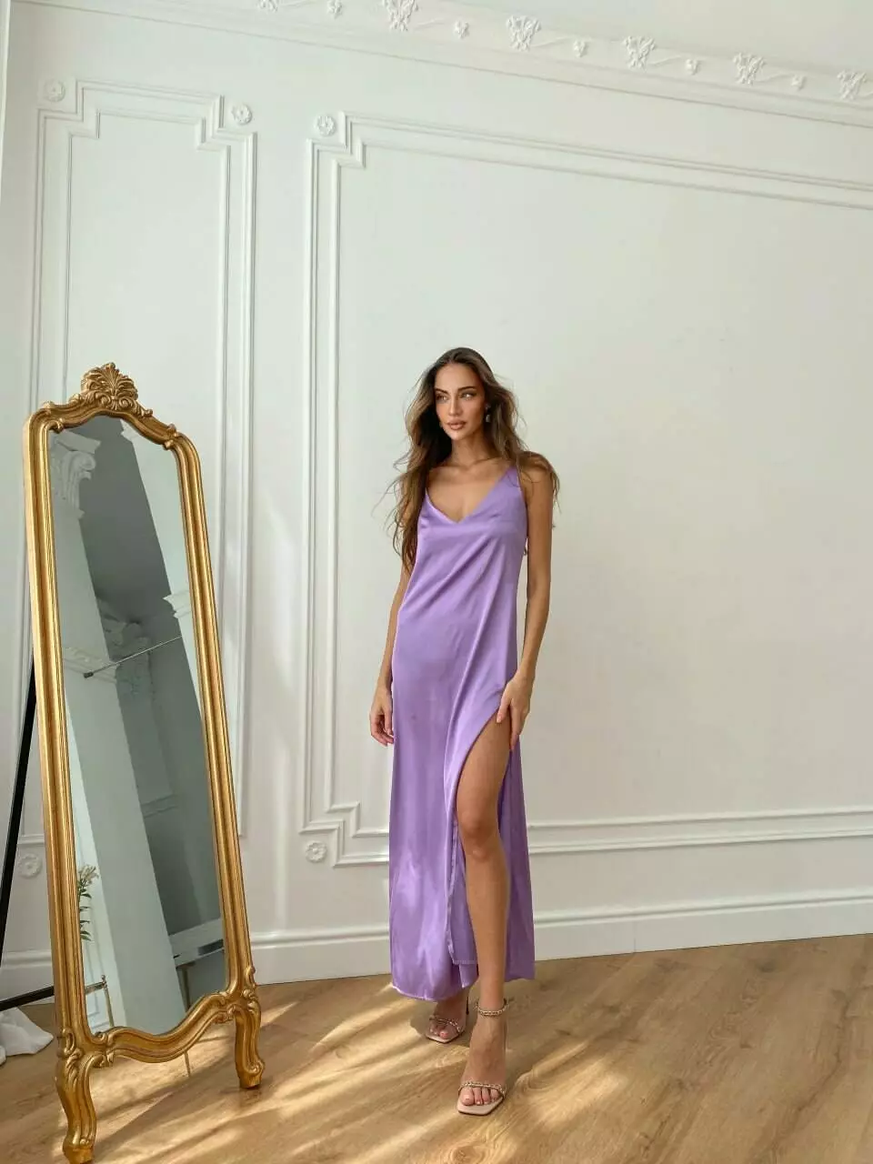 Модель поєднує ніжність шовку та вишуканий V-подібний виріз, та регульовані бретелі підкреслюють жіночність