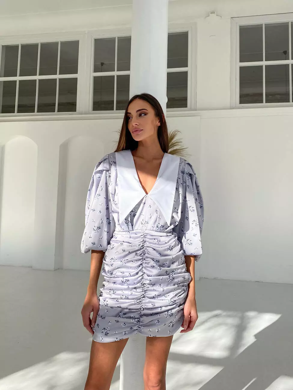 Романтична сукня оздоблена V-подібним декольте з відкладним комірцем білого кольору та пишними рукавами 3/4 завдовжки ❤️