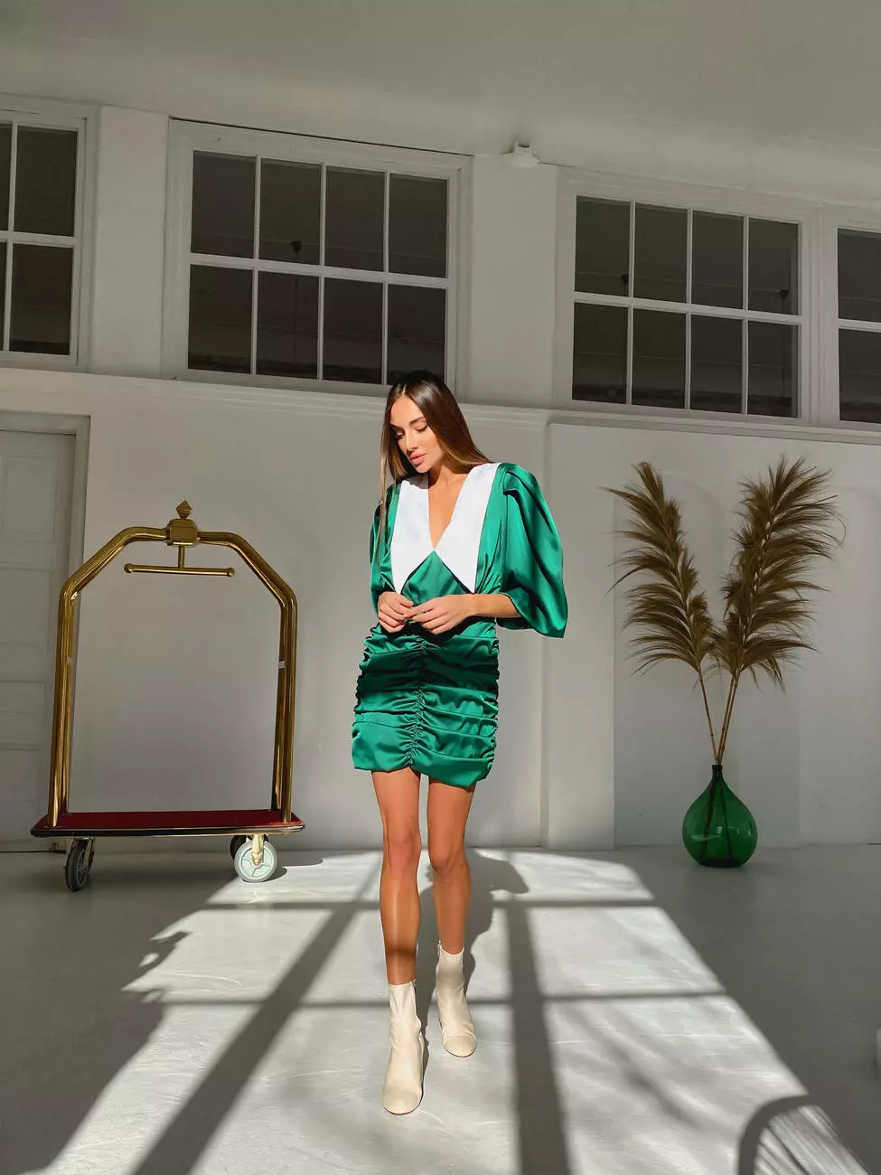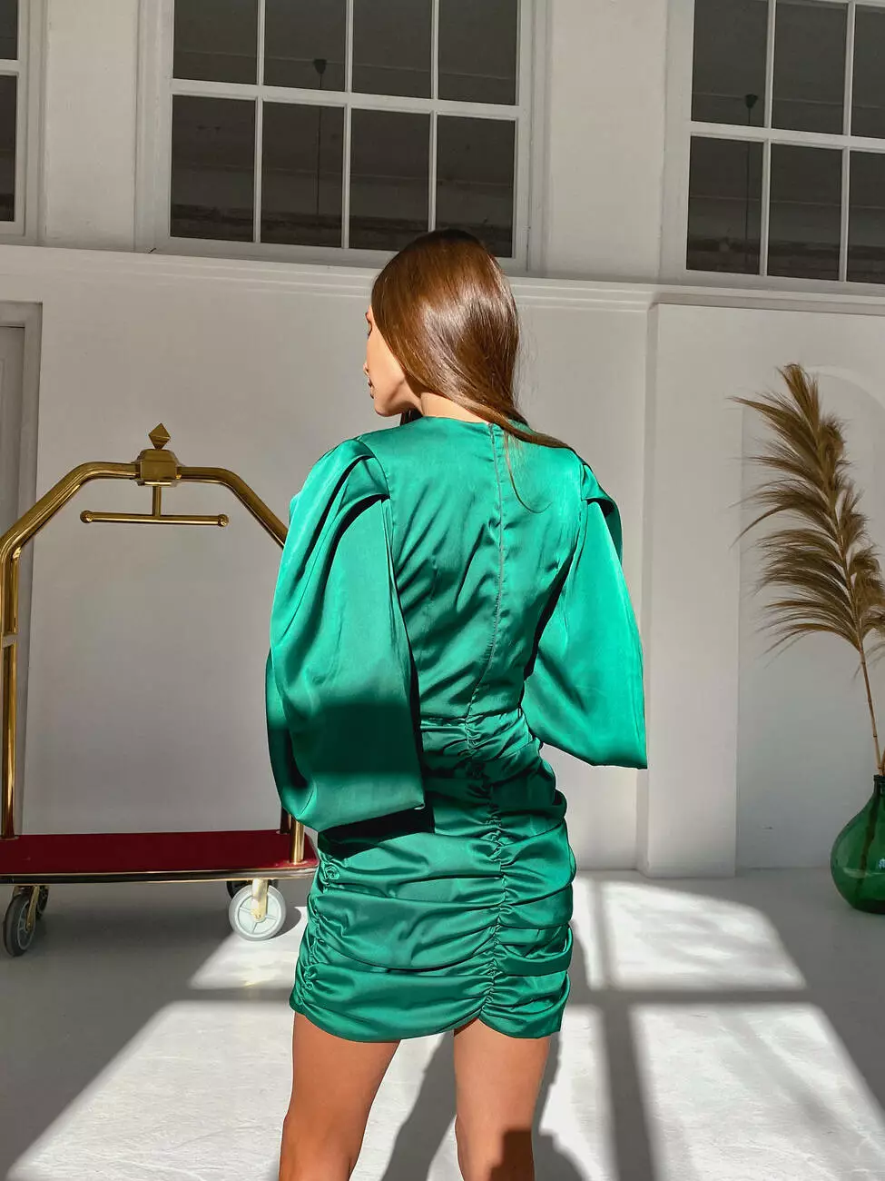 Стильна трендова шовкова міні сукня Kamilla з відкладним комірцем та V-подібним декольте смарагдового кольору