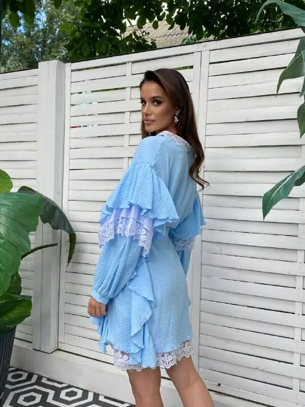 Бавовняна сукня з мереживом має вільний крій і тому має чудовий вигляд на будь-якій фігурі, має волани на рукавах і застібається на ґудзики Повітряна сукня в стилі орнаментів прикрашена мереживами на комірі, рукавах та знизу виробу, пояс в тон йде у комплекті