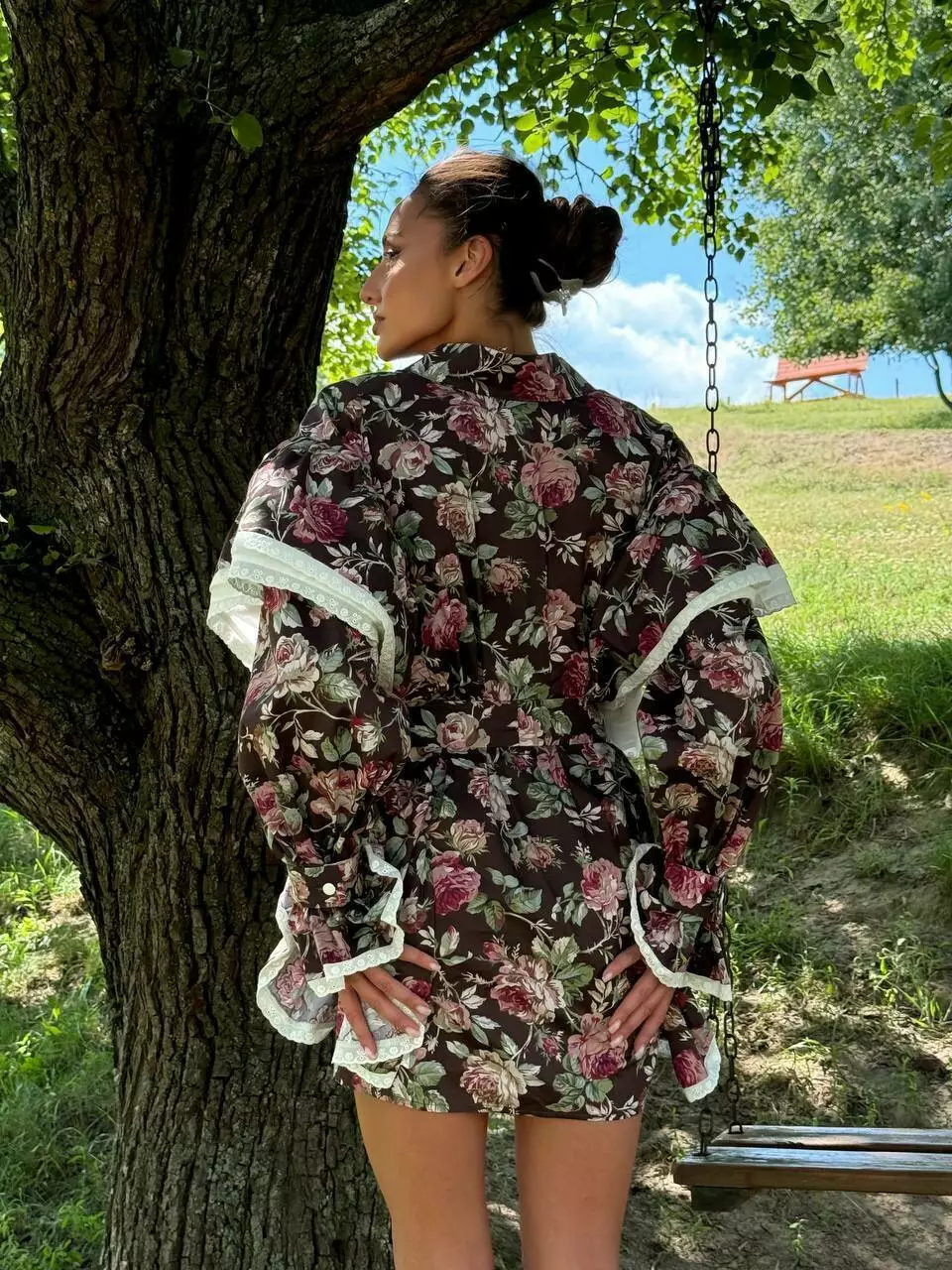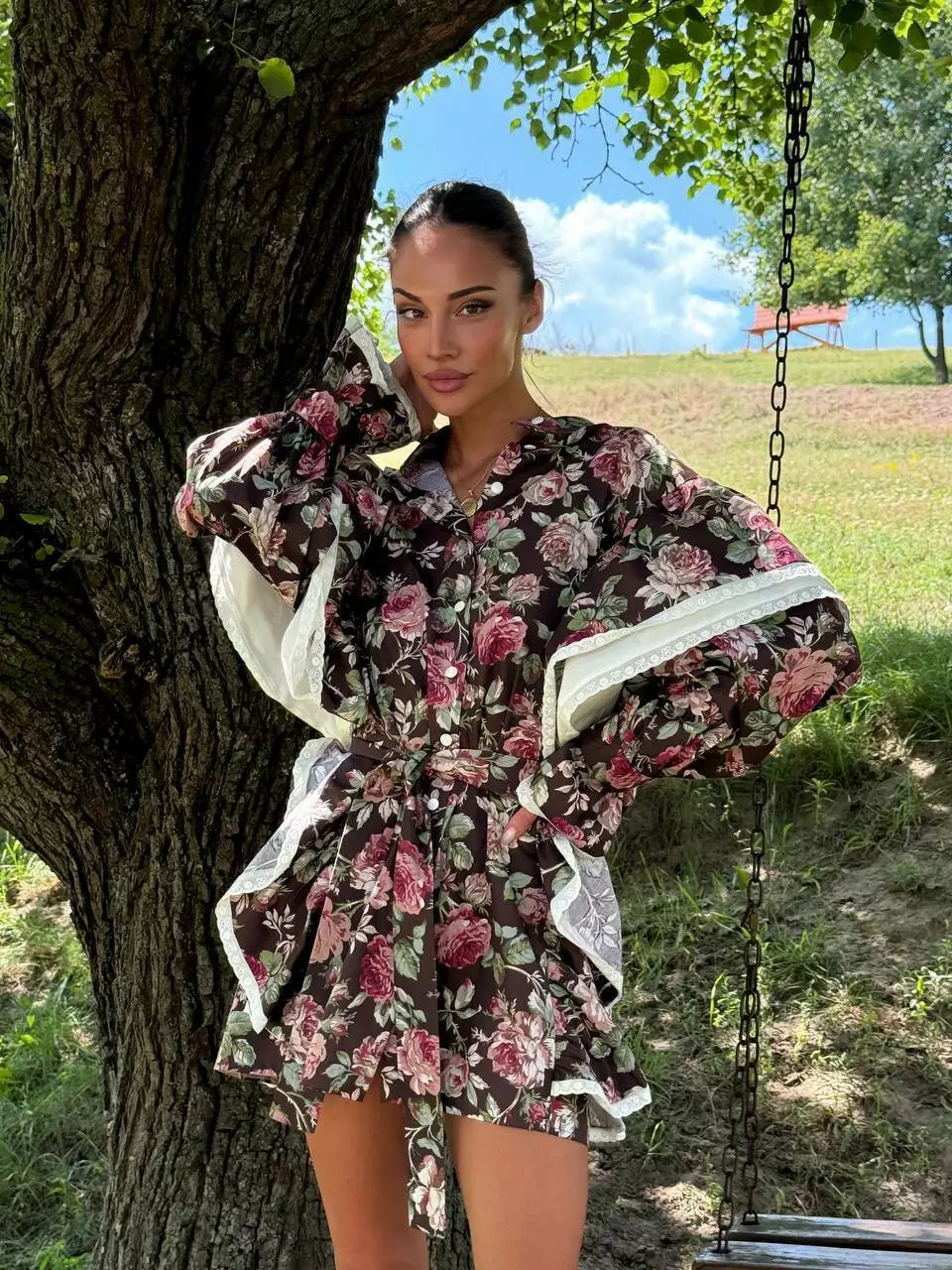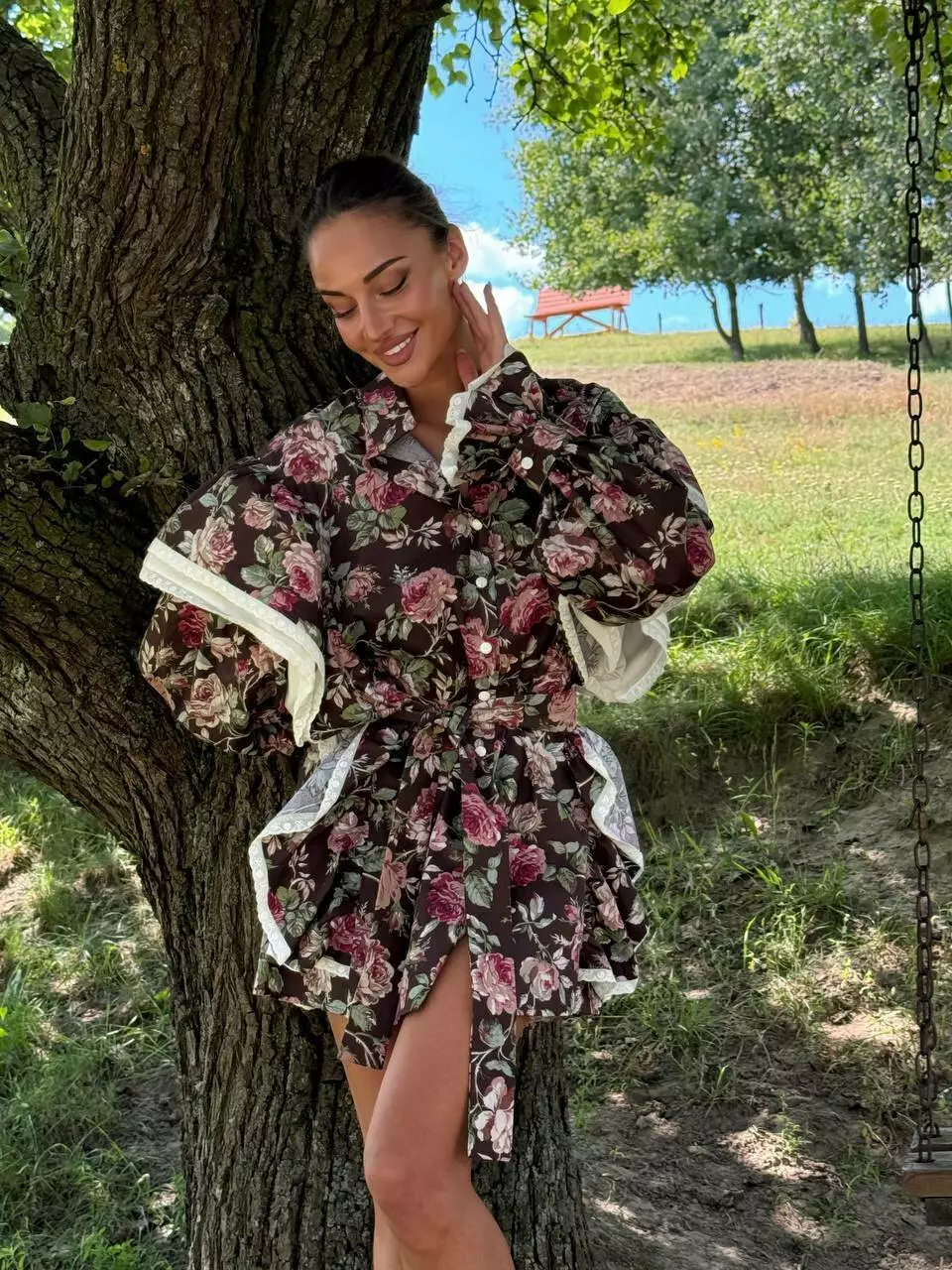Бавовня сукня в квіти в стилі бохо, декорована прошвою. Має крій прямої сорочки з воланами.