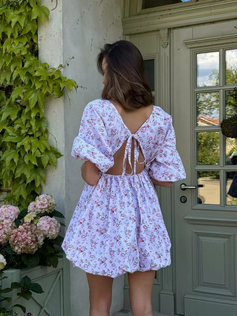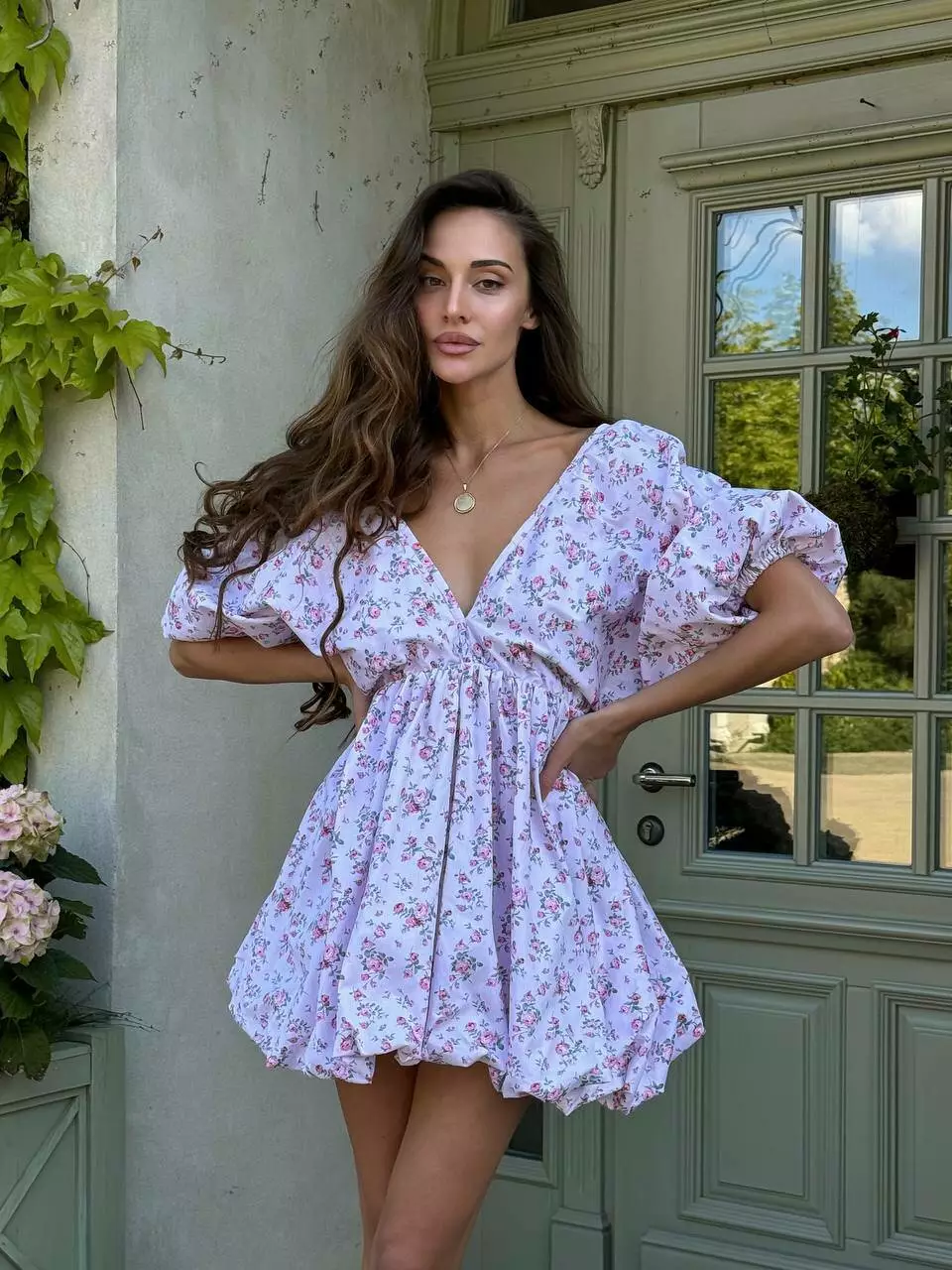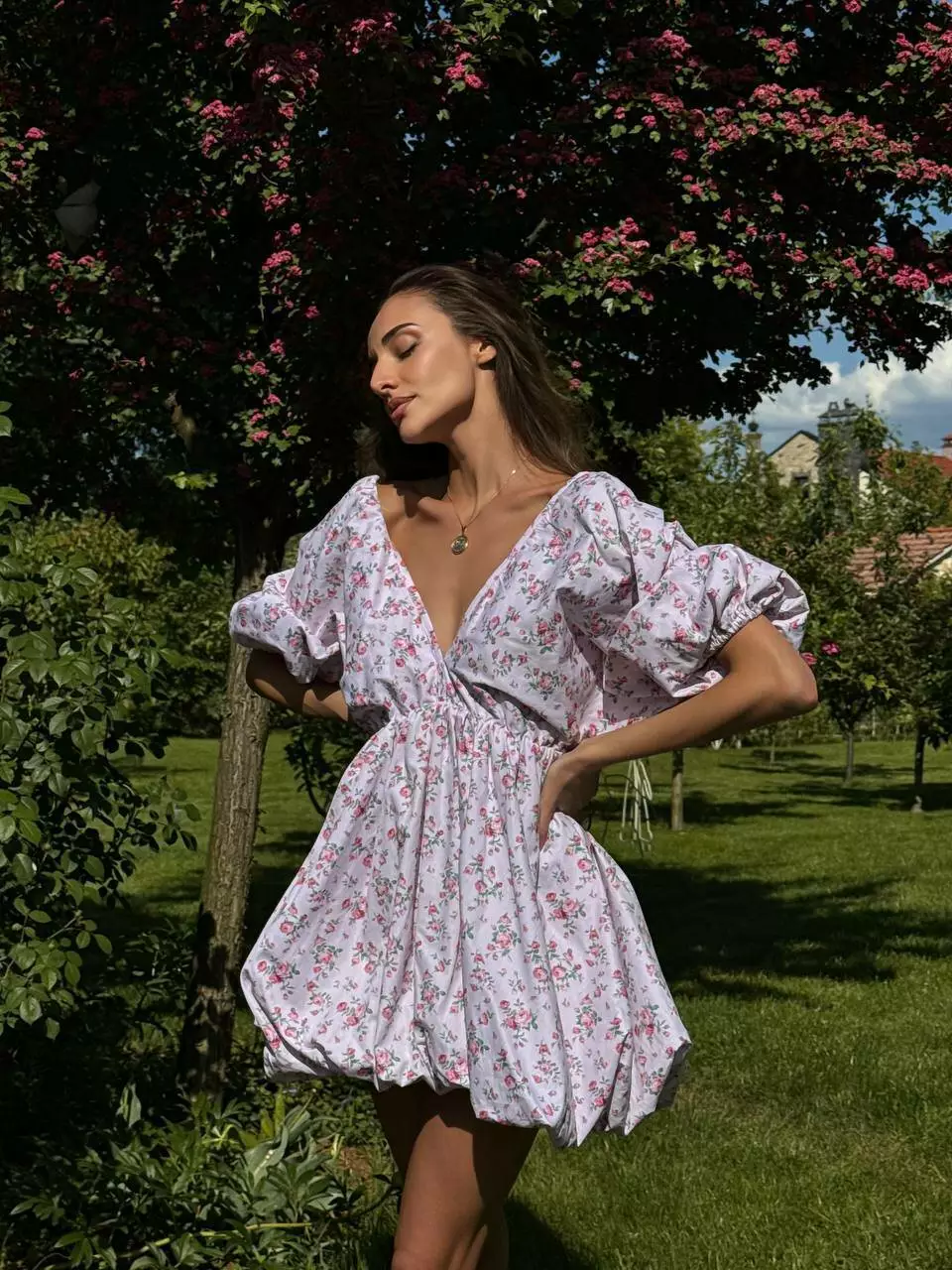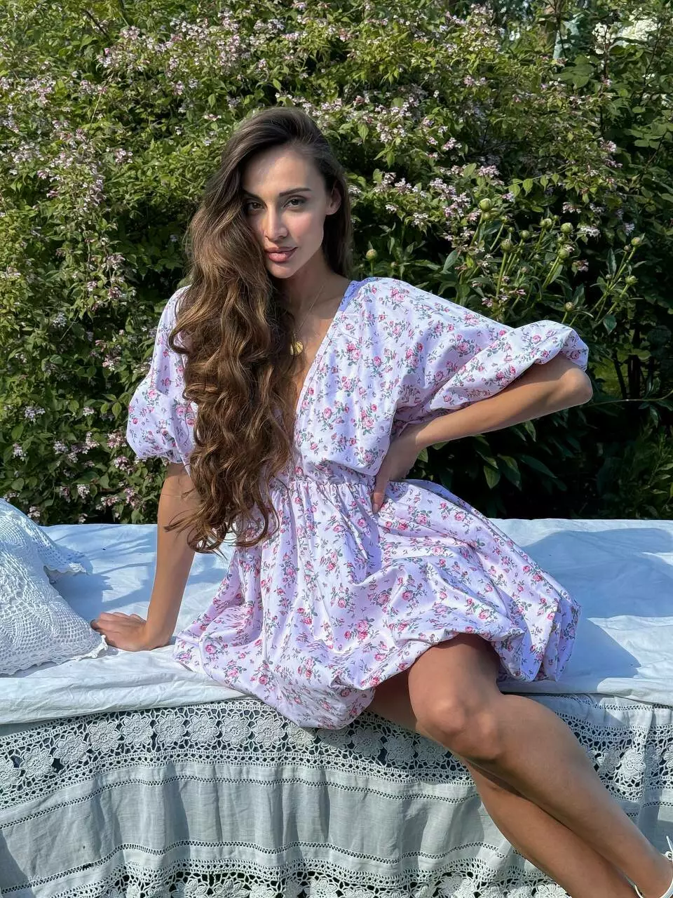 Бавовняна сукня с стилі хмарки ( балон), обʼємна широка повітряна спідниця та верх в літуча миша. Сукня регулюється завʼязкою по спинці. Спинка оголена Глибоке декольте, але досить стримане Талія на резинці По заду в спідниці змійка.