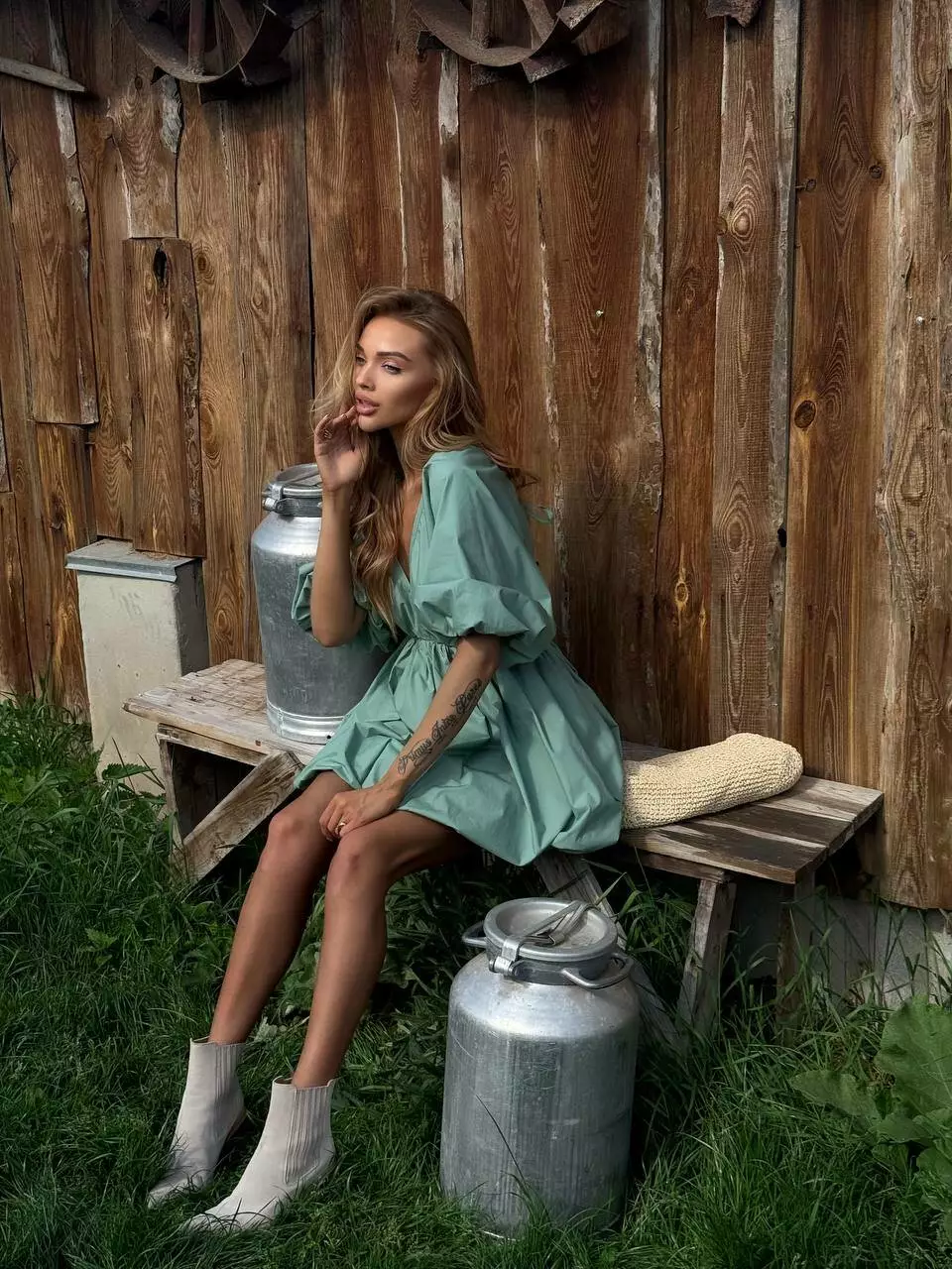 Бавовняна сукня с стилі хмарки ( балон), обʼємна широка повітряна спідниця та верх в літуча миша. Сукня регулюється завʼязкою по спинці. Спинка оголена Глибоке декольте, але досить стримане Талія на резинці По заду в спідниці змійка.