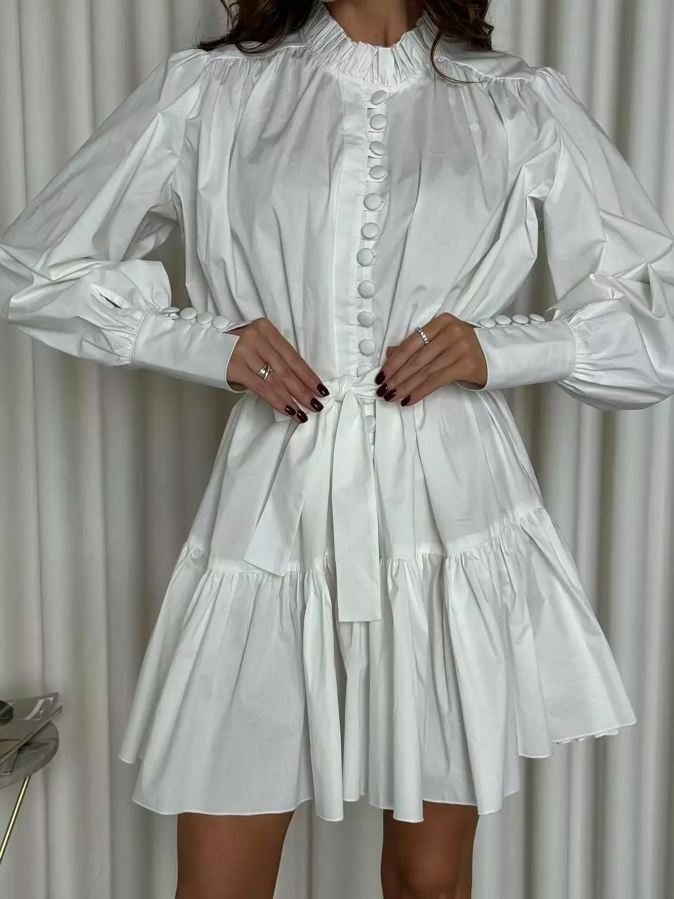 Виконана з якісної бавовняної тканини з безліччю ґудзиків та зборкою по юбці. Пояс в комплекті що легко регулює довжину завдяки напуску.