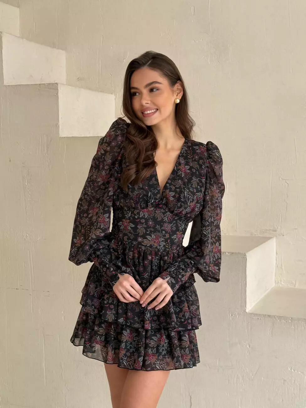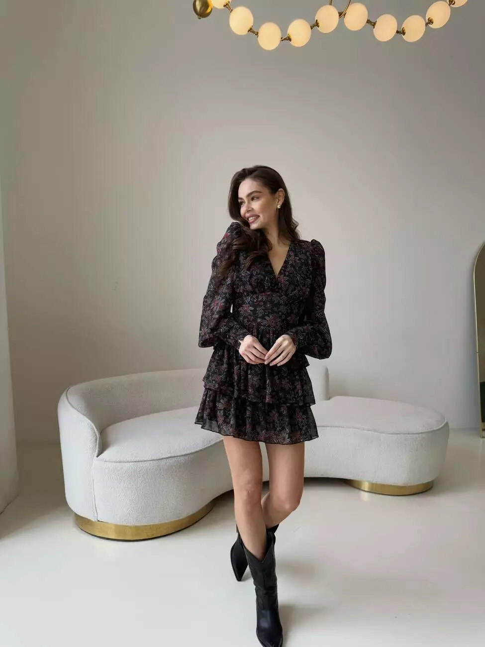 Тендітна повітряна сукня, з V -образним декольте. Талія має ефект утяжки талії, по спинці резинка. Широкі манжети рукавів декоровані ґудзиками обтягнутими в тканину. Спідниця 3 шарова та пишна.