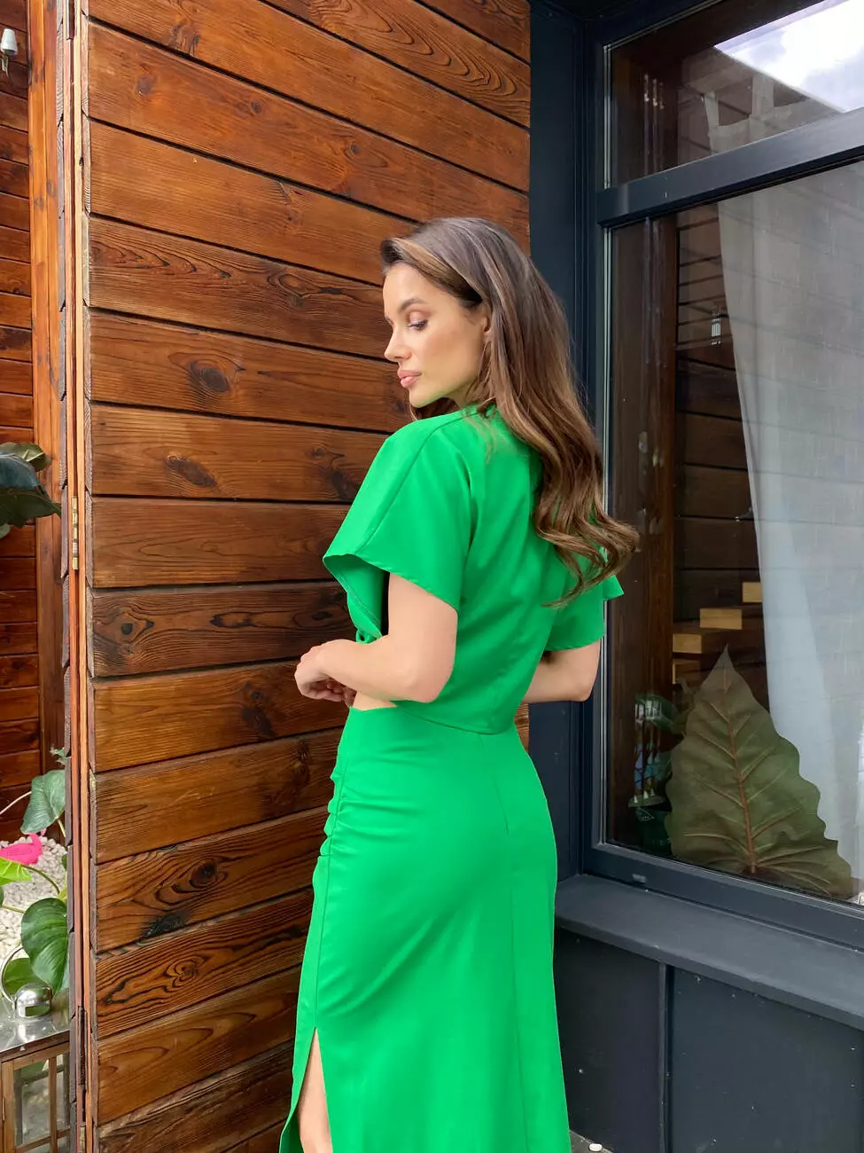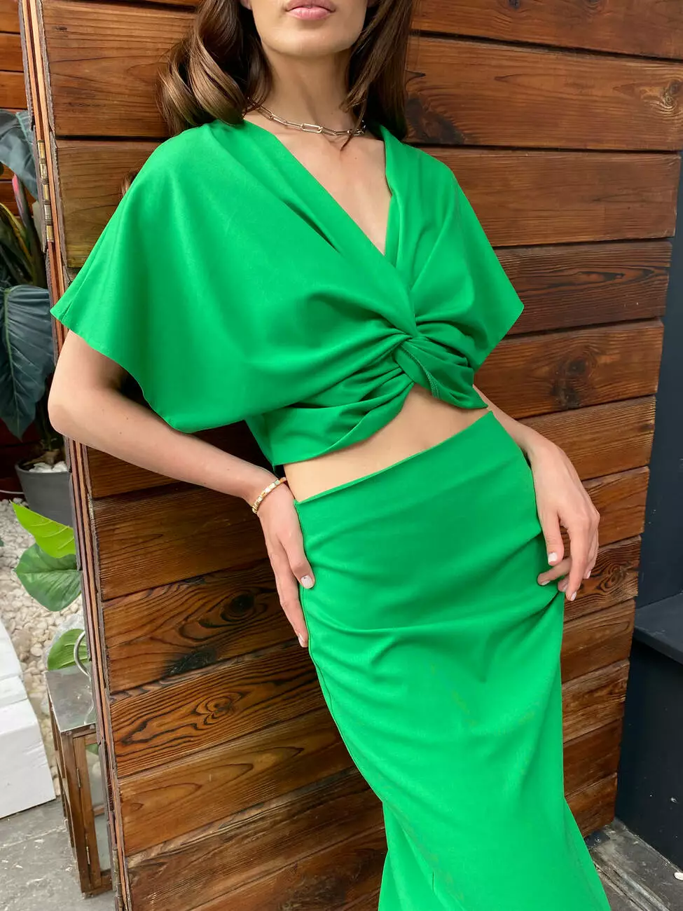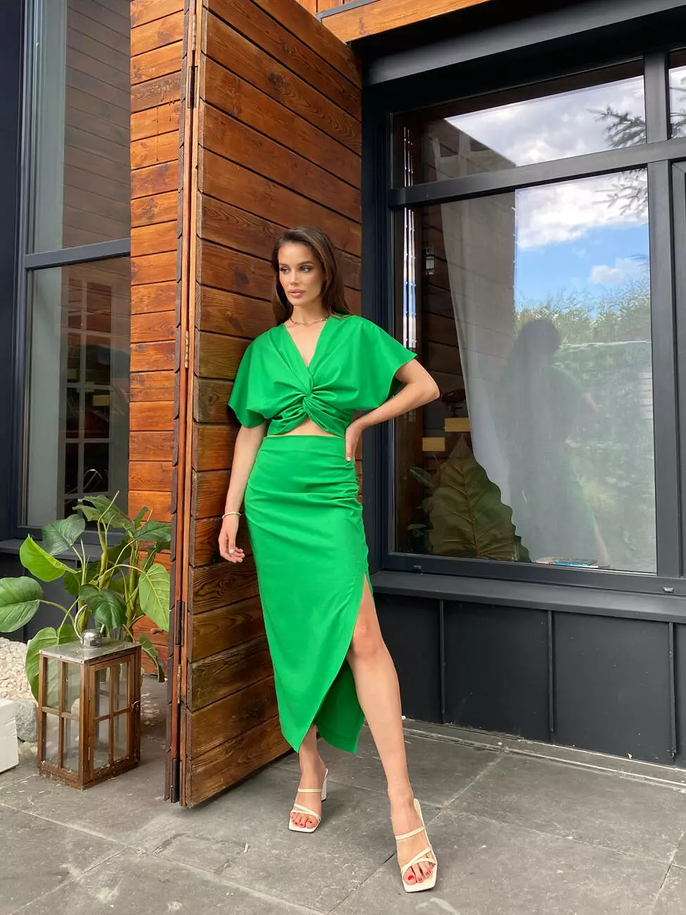 Вишуканий костюм MON CHERY топ без рукавів та спідниця міді з розрізом колір трава