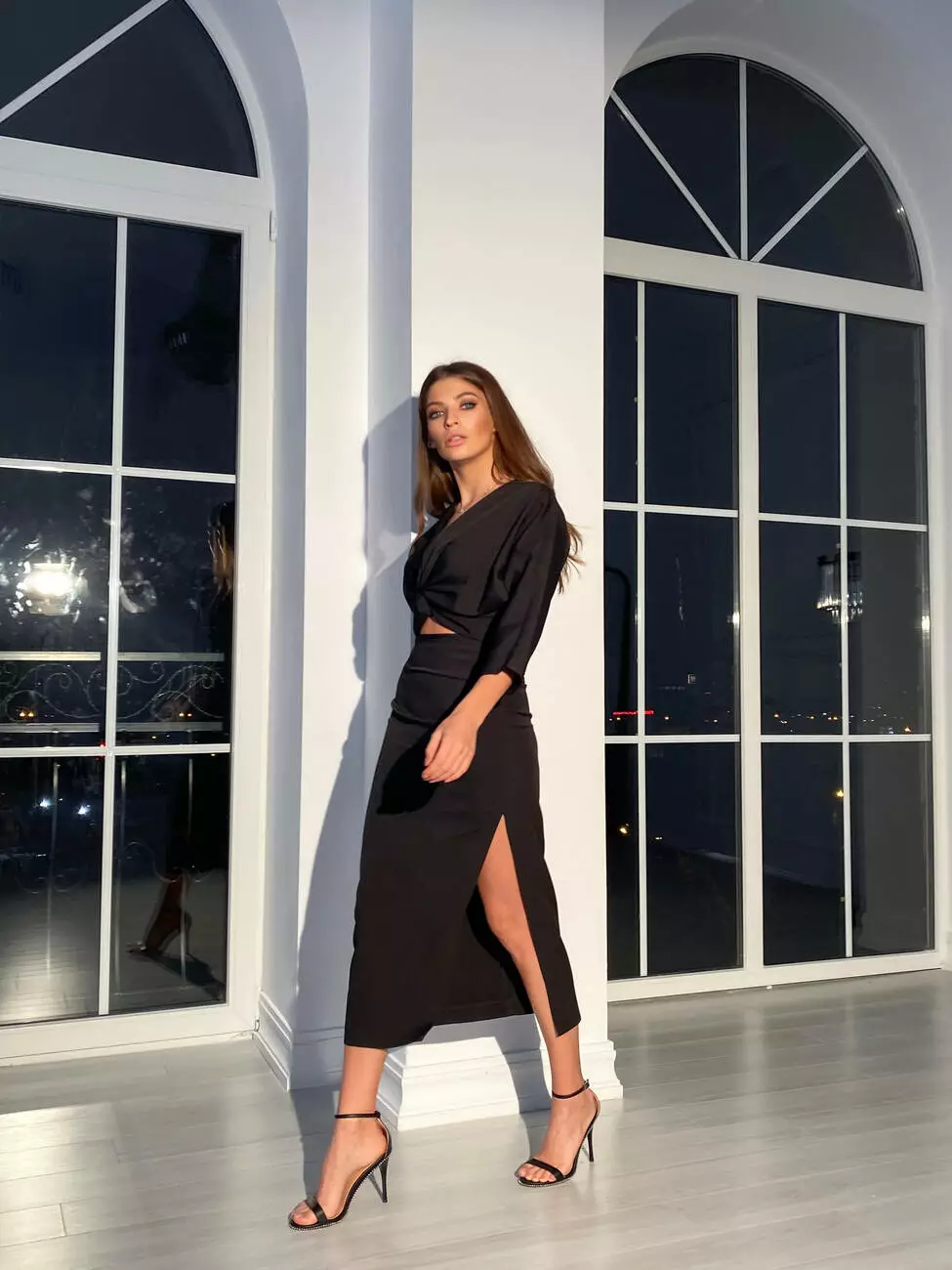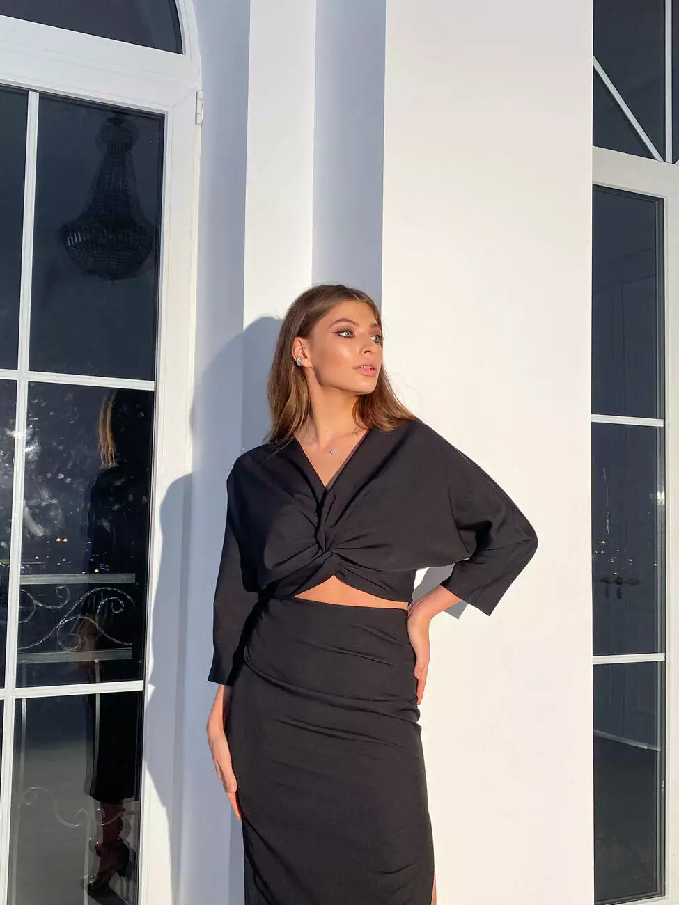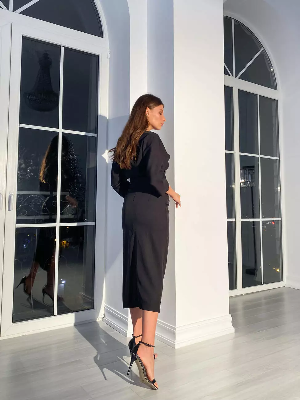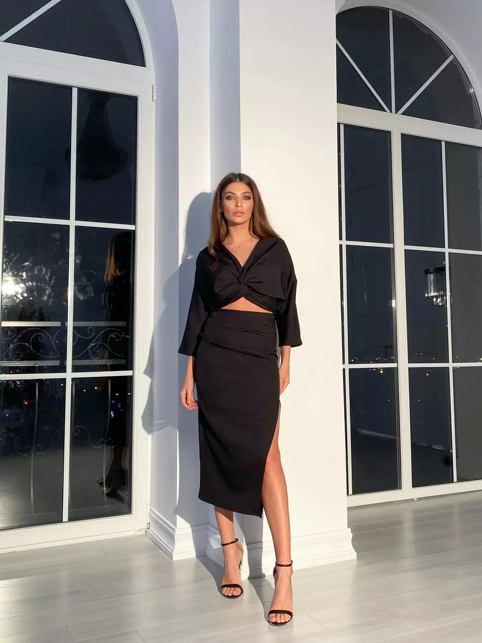 Вишуканий костюм MON CHERY топ з рукавами та спідниця міді з розрізом колір чорний