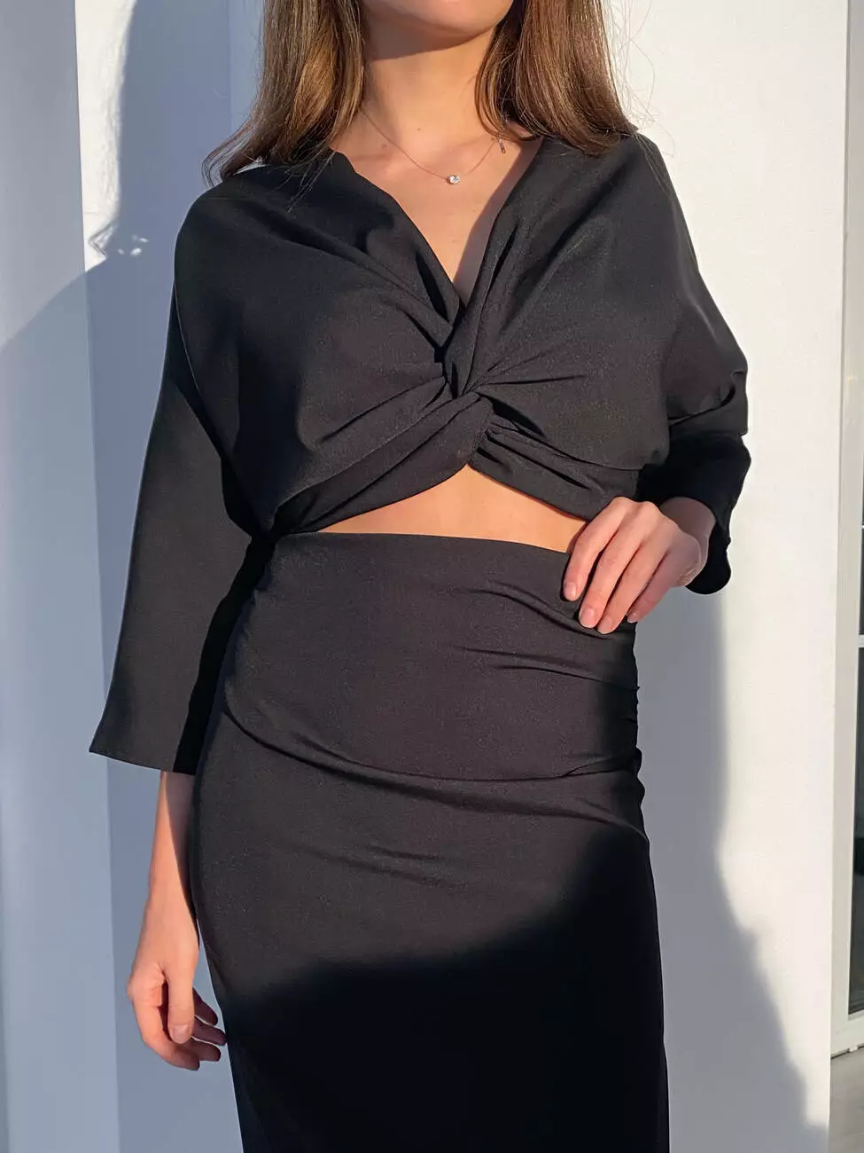 Топ з палітуркою та спідниця міді зі складанням та розрізом на